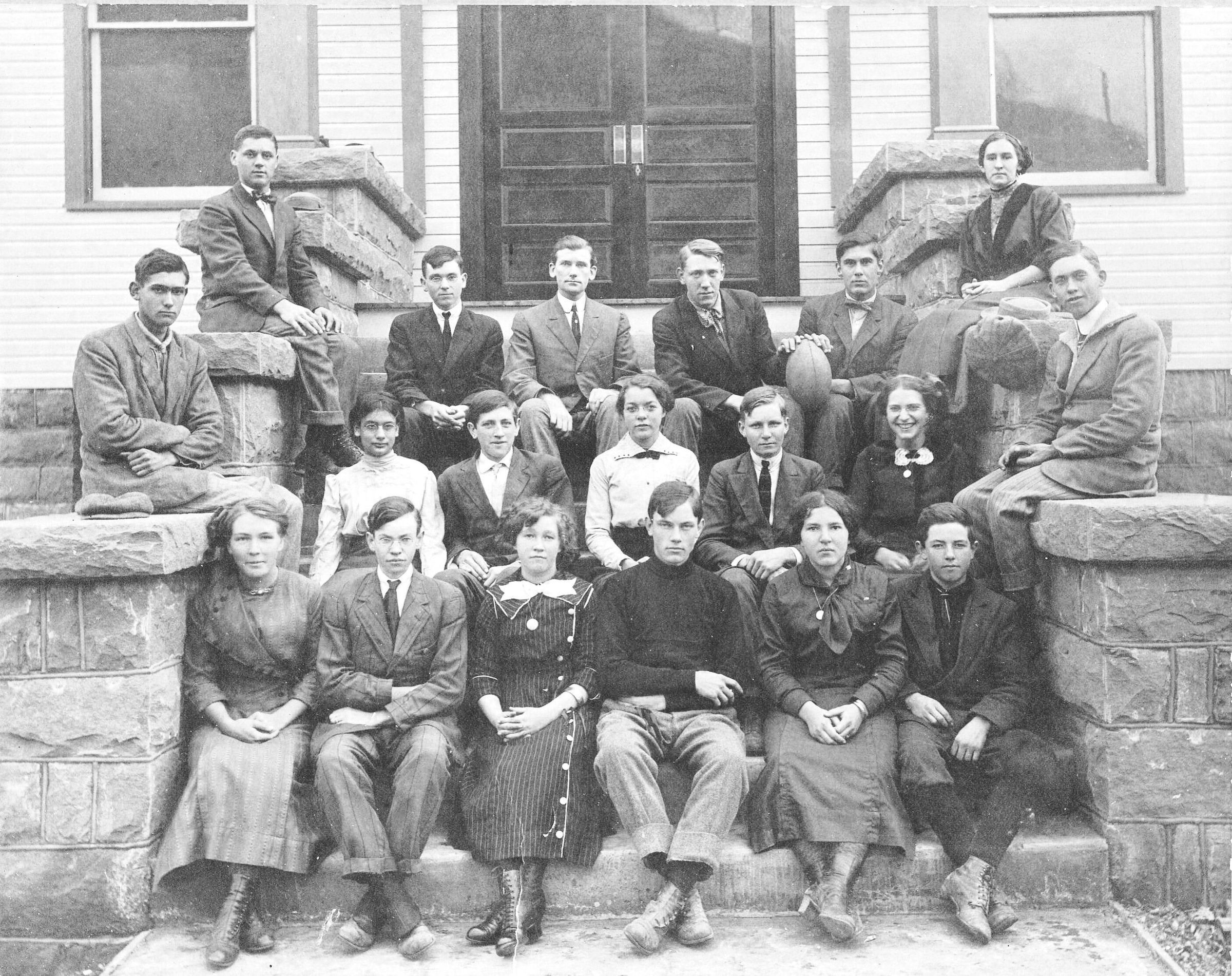 Source Citation: Aleppo High School students, item no. RIGL-AN001-0020, Lewis Perry and Nora Etta (Kuhn) Riggle Collection, shared by Paula (Riggle) Whitfill and her aunt Joyce (Riggle) Hoover, Greene Connections Archives Project (www.GreeneConnections.com).