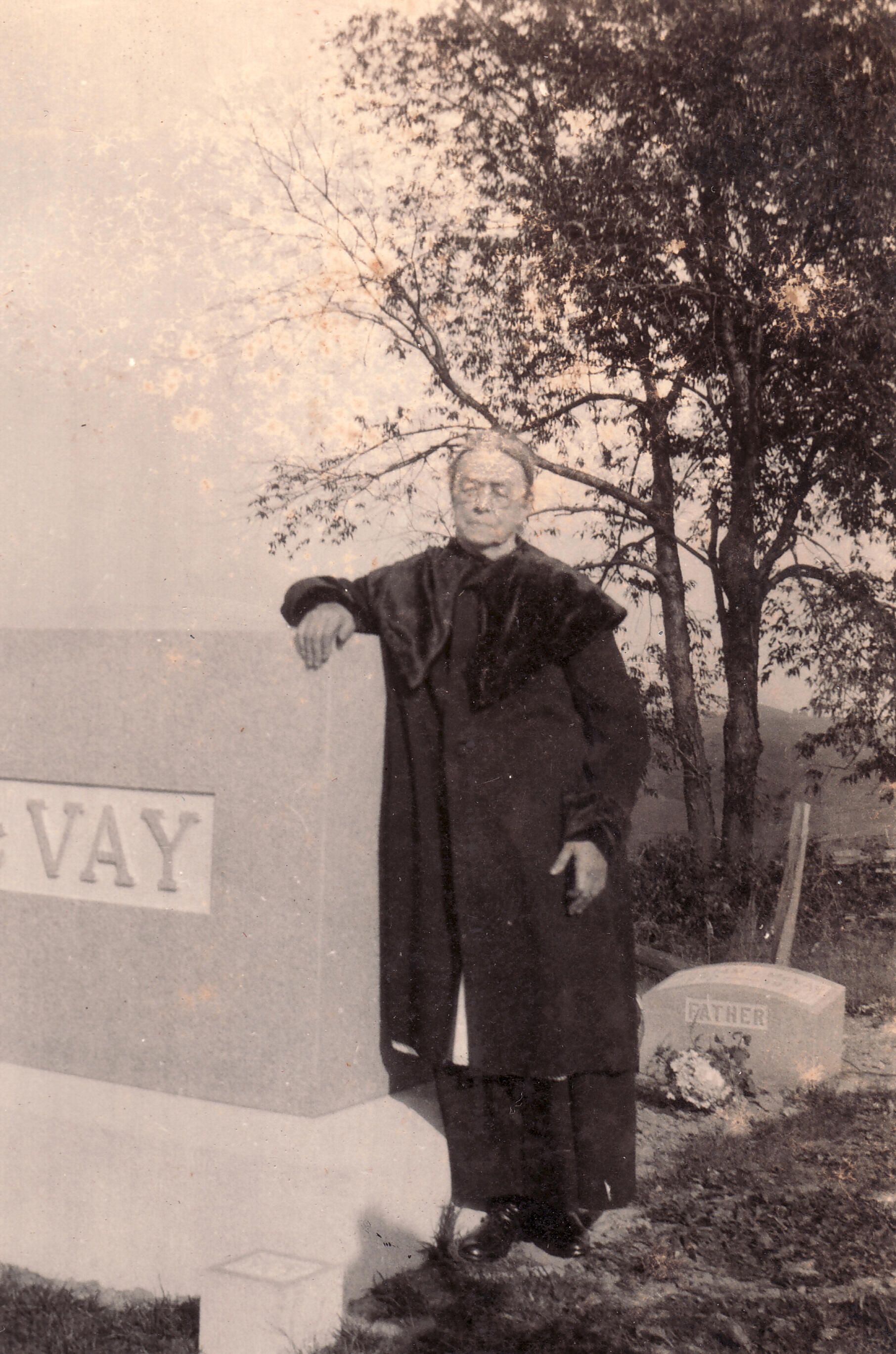 Source Citation: Almyra "Myra" (Wilson) McVay at the grave of her husband Randolph M. "Mac" McVay, item no. MCVA-AN001-0044M, Rex and Irene Marie (Morgan) McVay Collection, shared by Lisa (McVay) Hook, Greene Connections Archives Project (www.GreeneConnections.com).