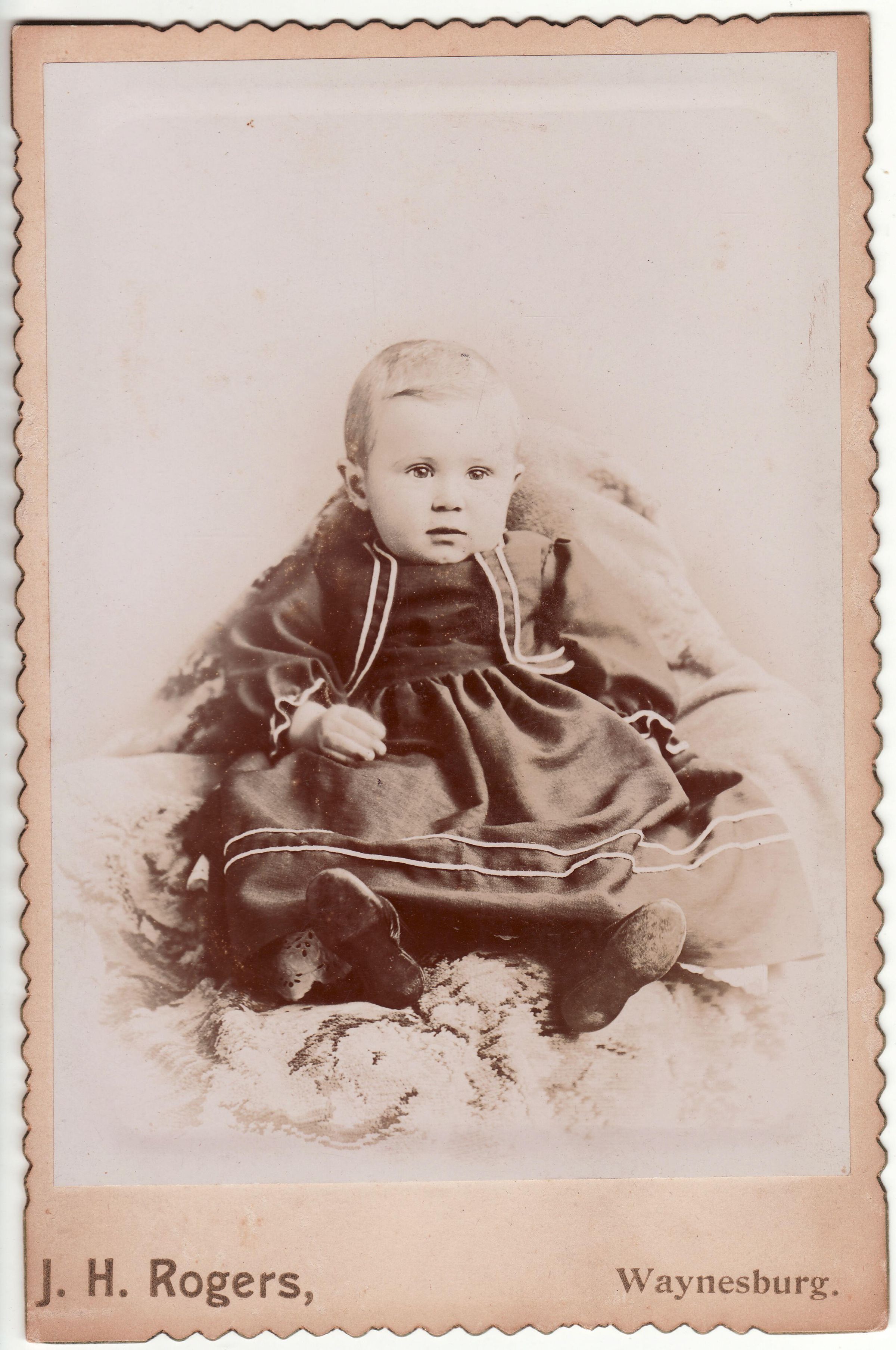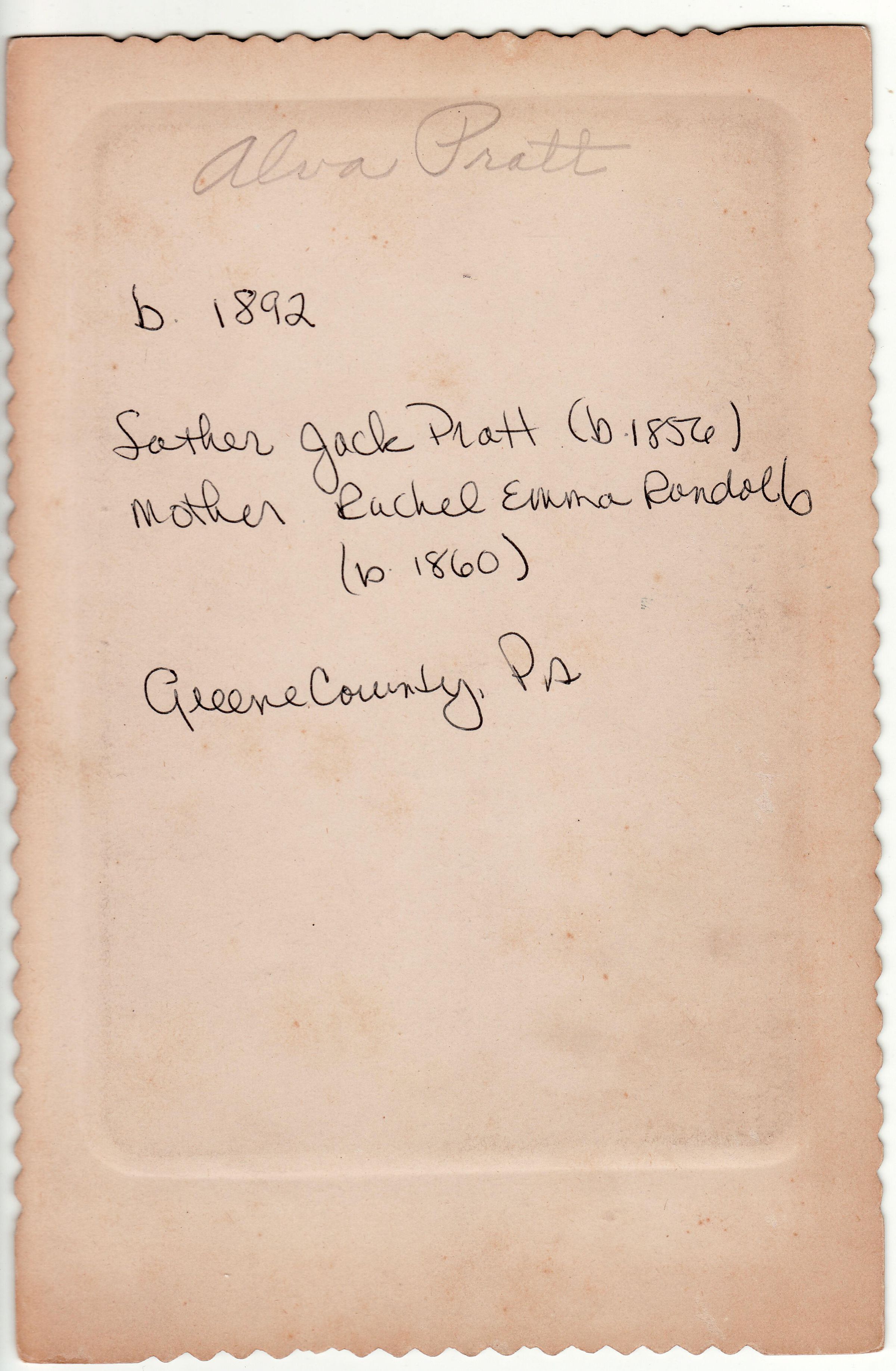 Source Citation: Alva Pratt [1893-1972] - son of James Andrew "Jack" Pratt and Rachel Emma Randolph; circa 1893-1895, image by J. H. Rogers, Waynesburg, [Pa.]; item no. AULD-AN001-0005, Pratt Series, Pratt-Auld Collection, shared by Julia Kathryn Johnson, Greene Connections Archives Project (www.GreeneConnections.com).