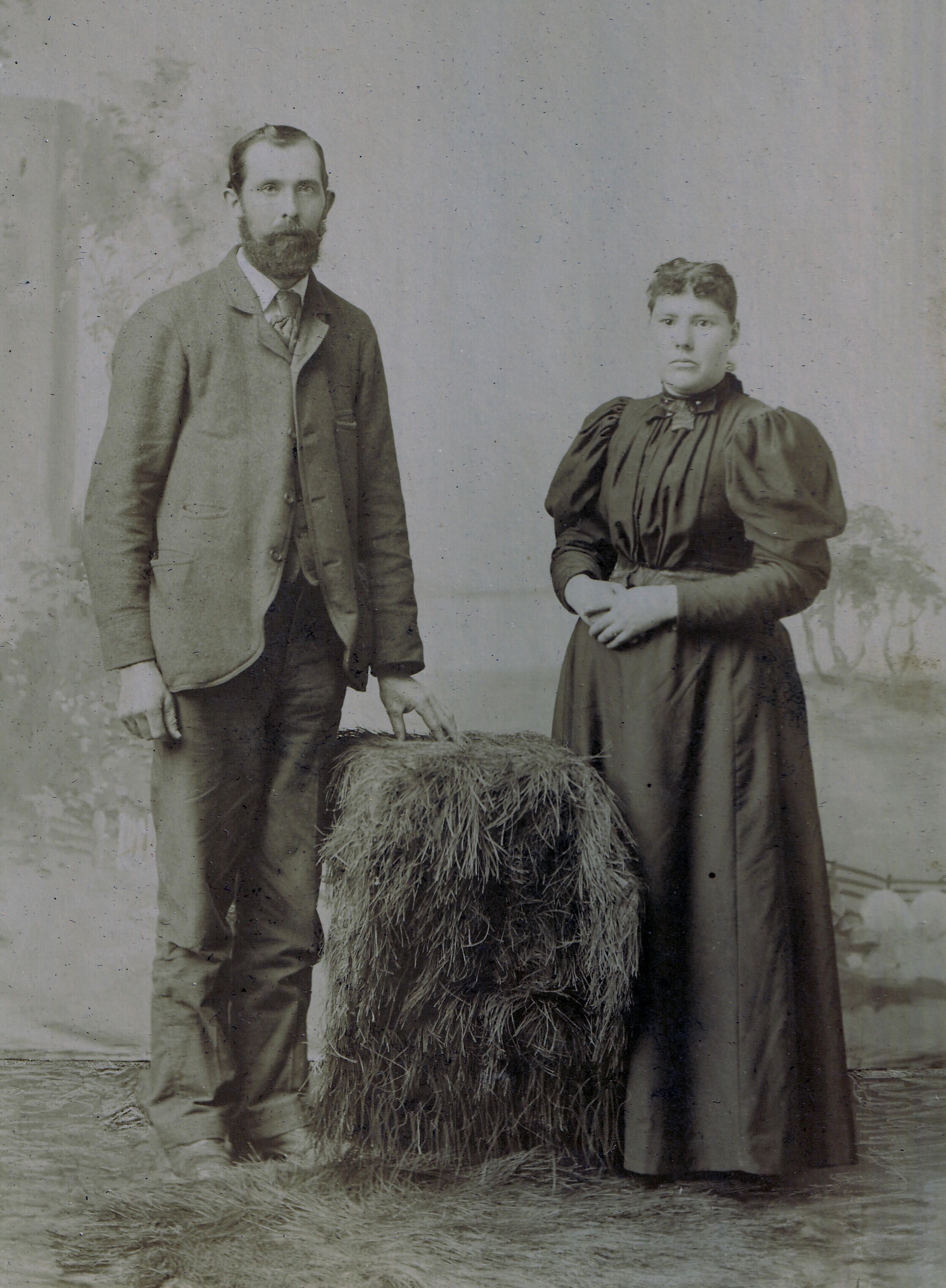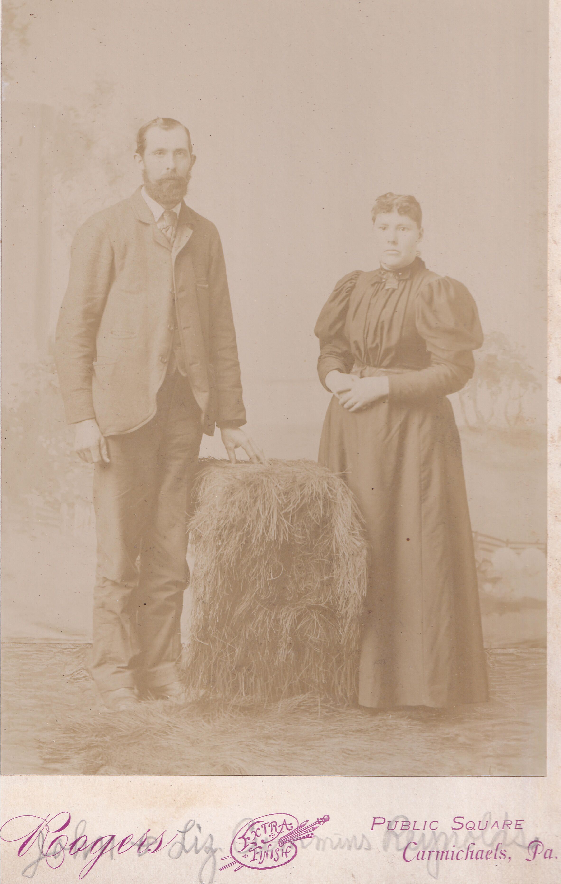 SOURCE CITATION: Ammons-Moredock Album 02, Photo 03 - John Reynolds [1865-1951] and his wife, Elizabeth Ann (Cummings) Reynolds [1865-1922]; circa 1890-1900, image by Rogers, Public Square, Carmichaels, Pa.; item no. MORE-AN003-0003, Ammons-Moredock Collection, Greene Connections Archives Project (www.GreeneConnections.com).