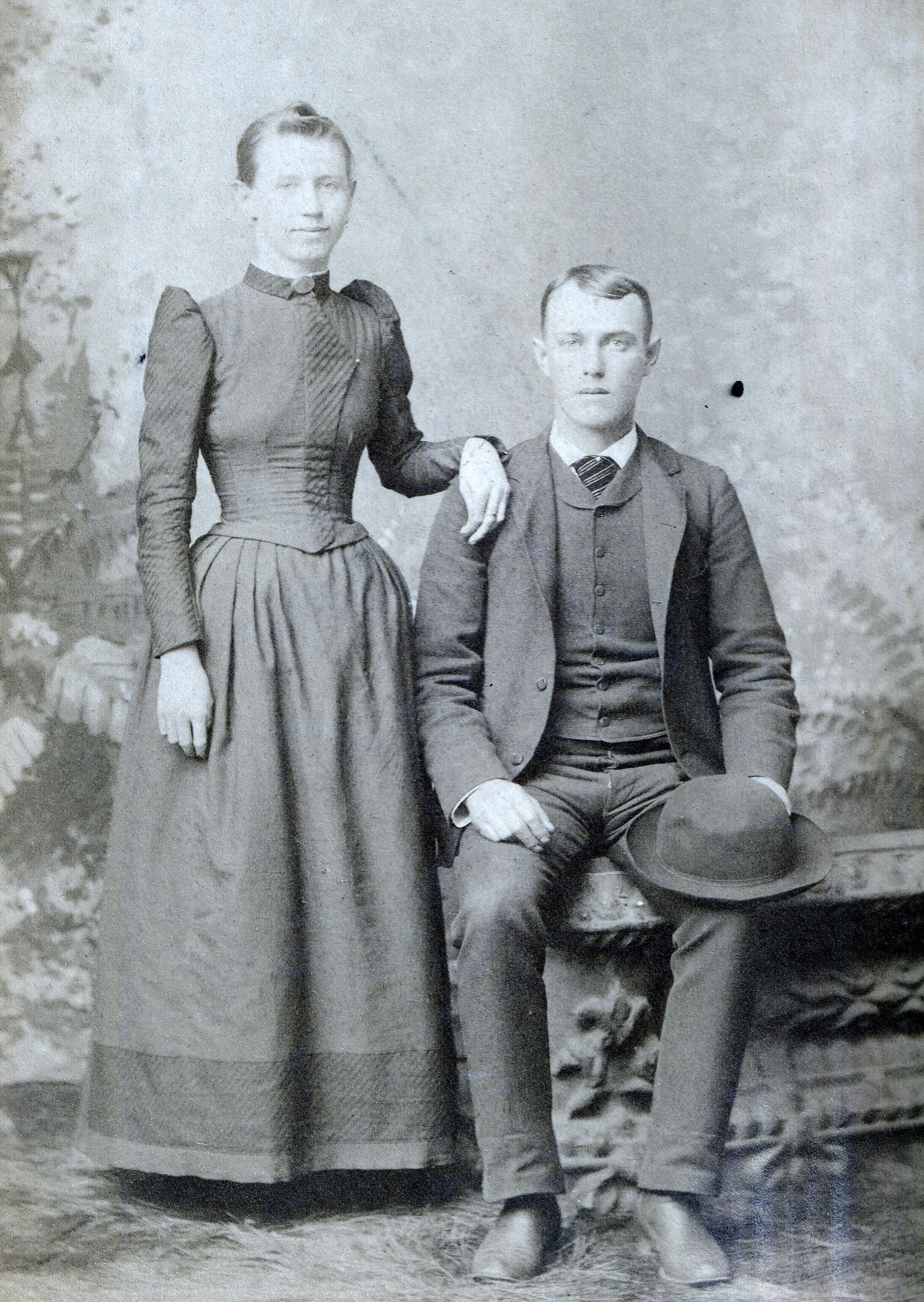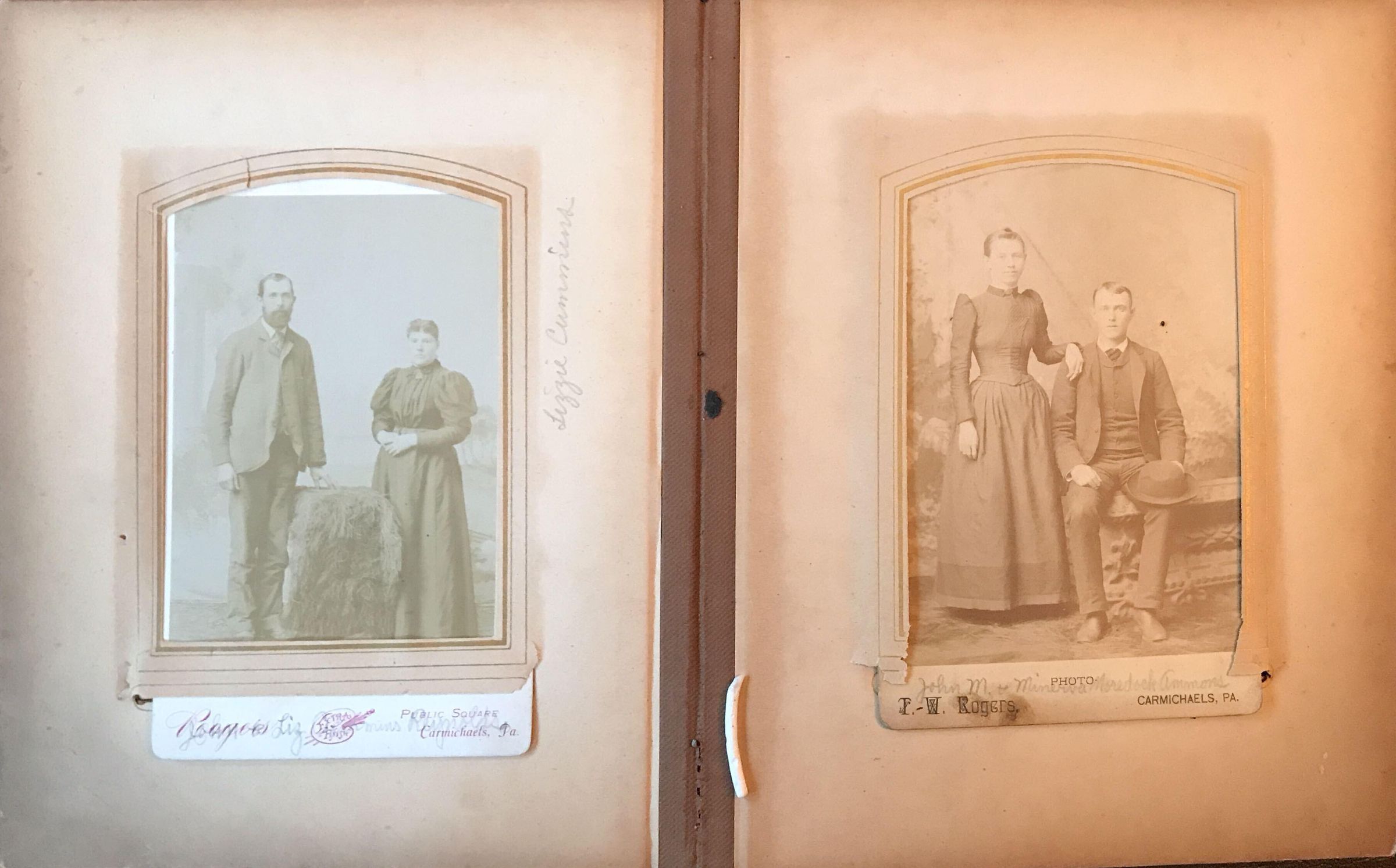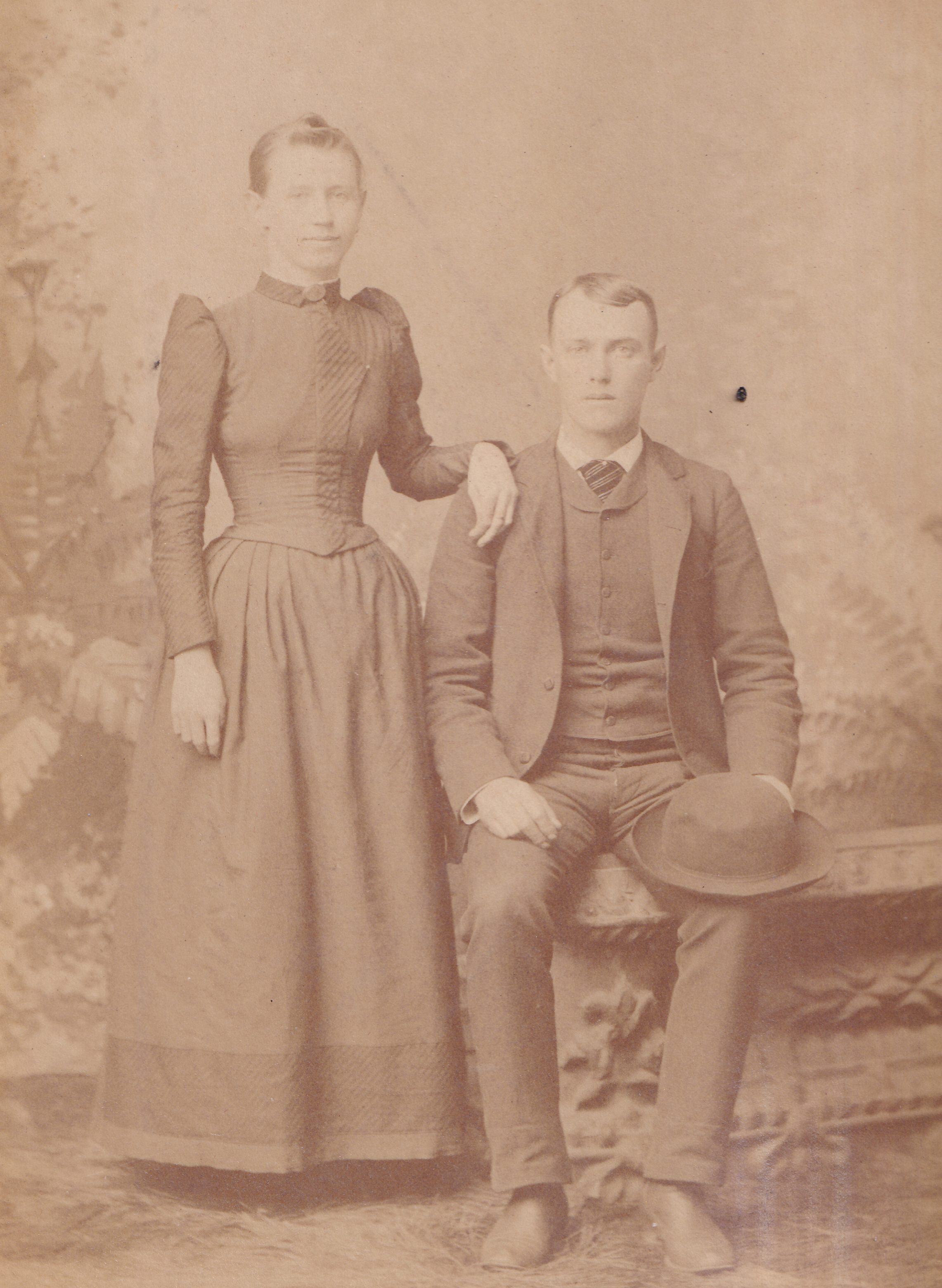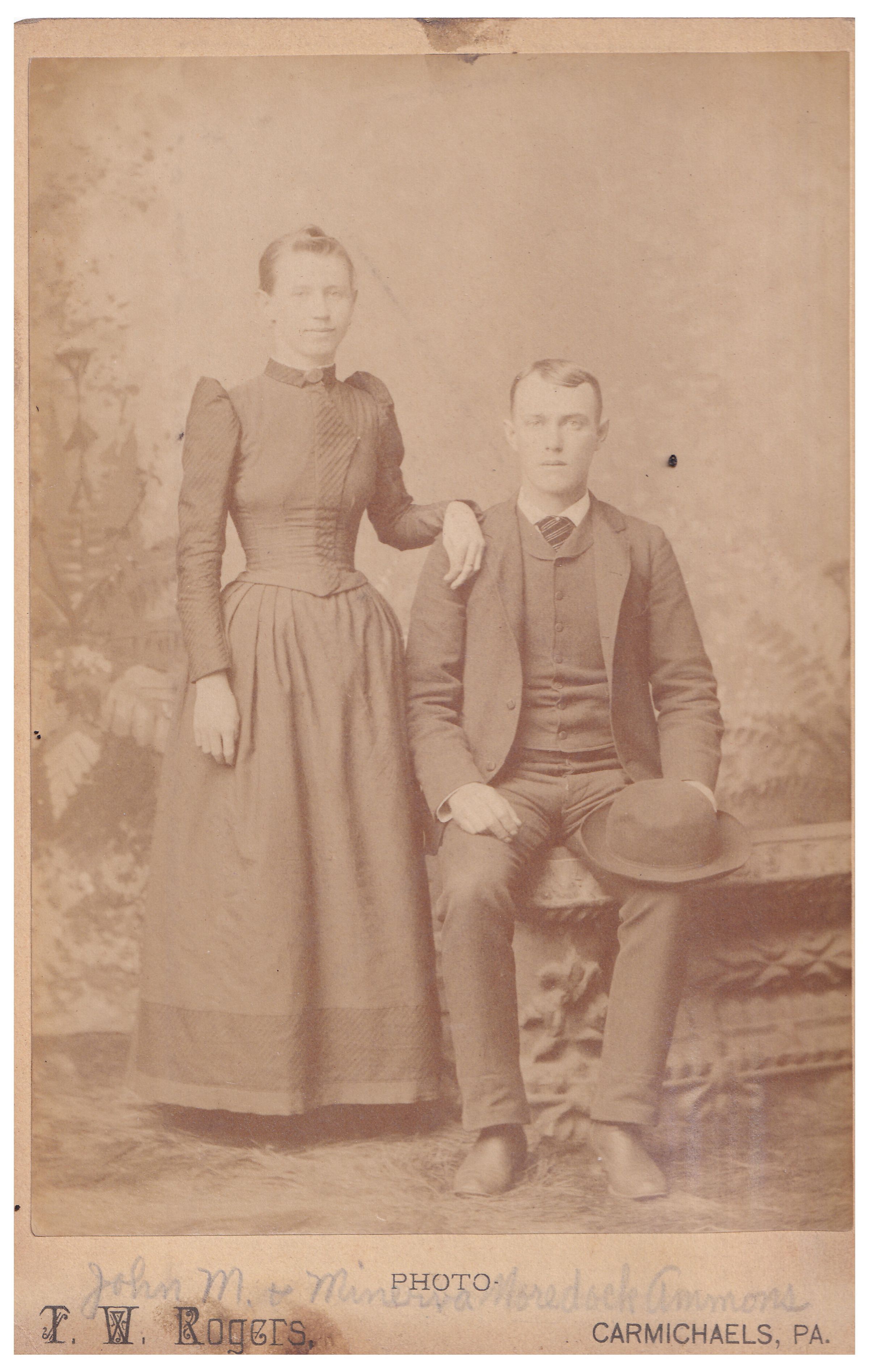 SOURCE CITATION: Ammons-Moredock Album 02, Photo 04 - John Milton Ammons [1863-1944] with his wife, Minerva (Moredock) Ammons [1871-1966]; circa 1890-1900, image by T. W. Rogers, Photo, Carmichaels, Pa.; item no. MORE-AN003-0004, Ammons-Moredock Collection, Greene Connections Archives Project (www.GreeneConnections.com).