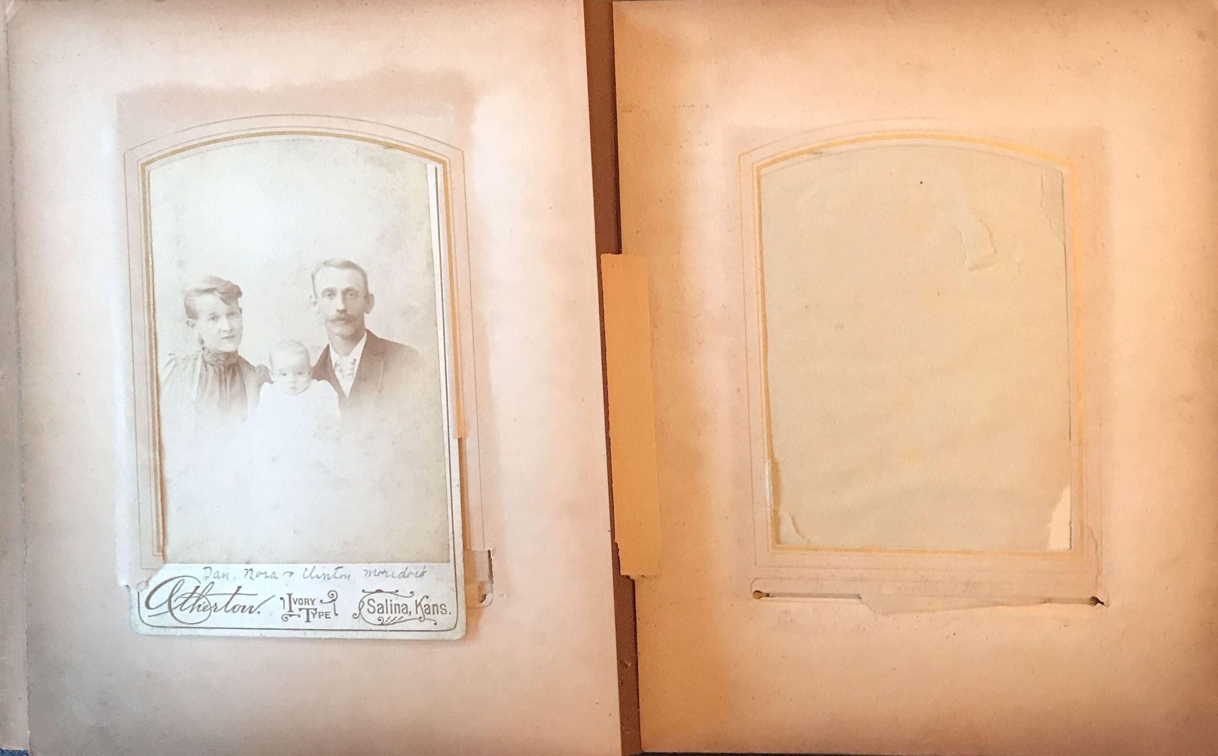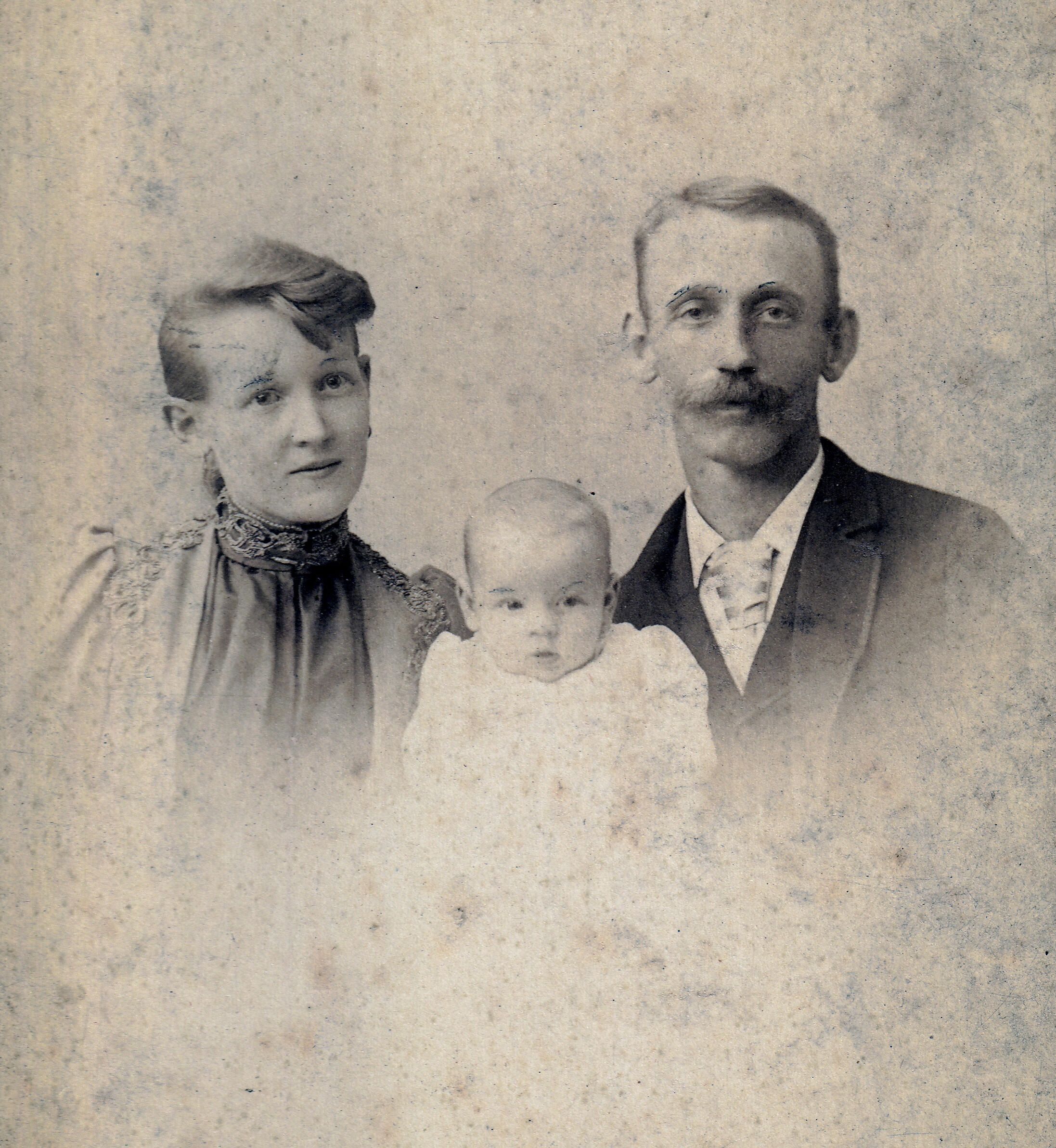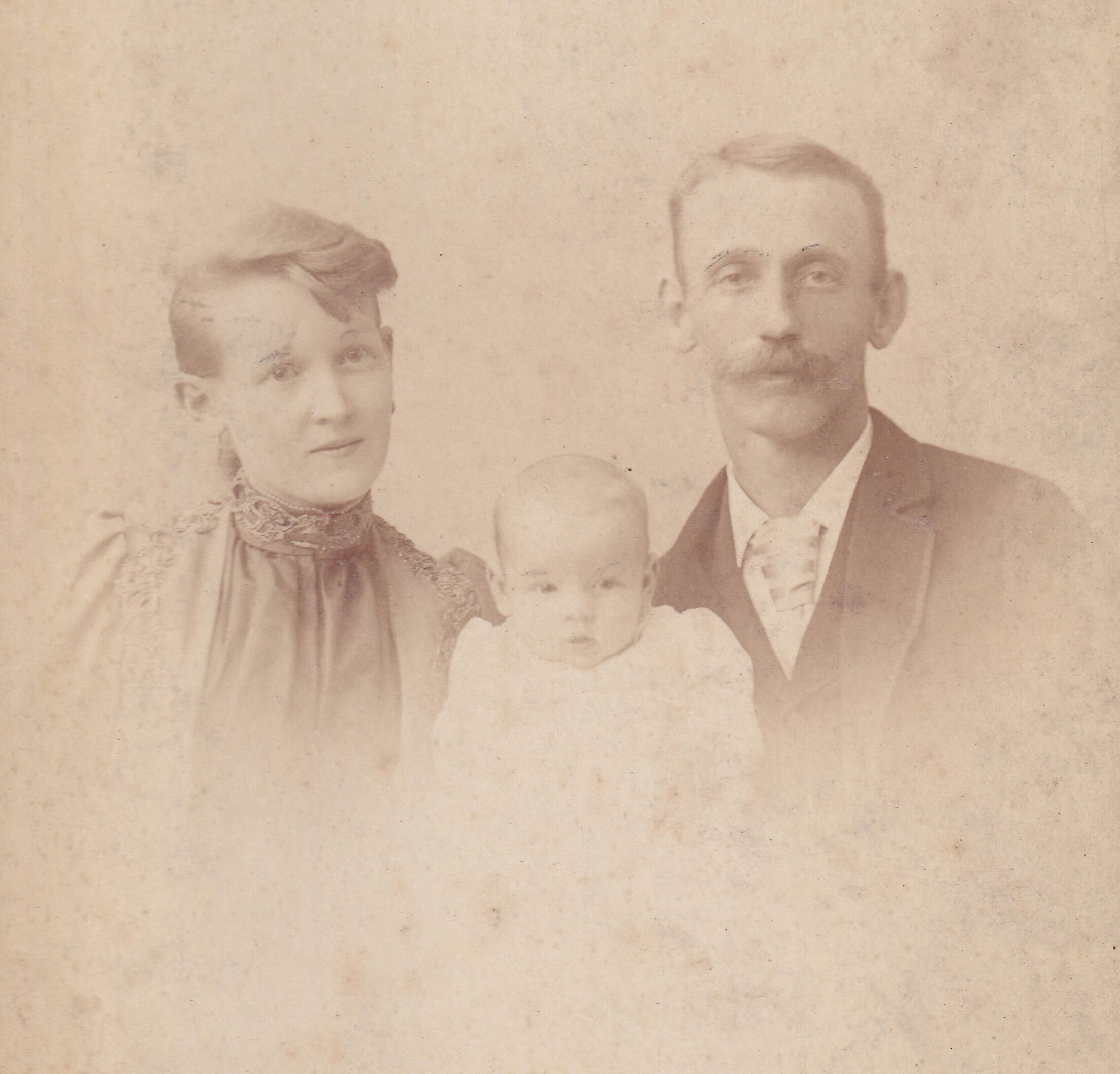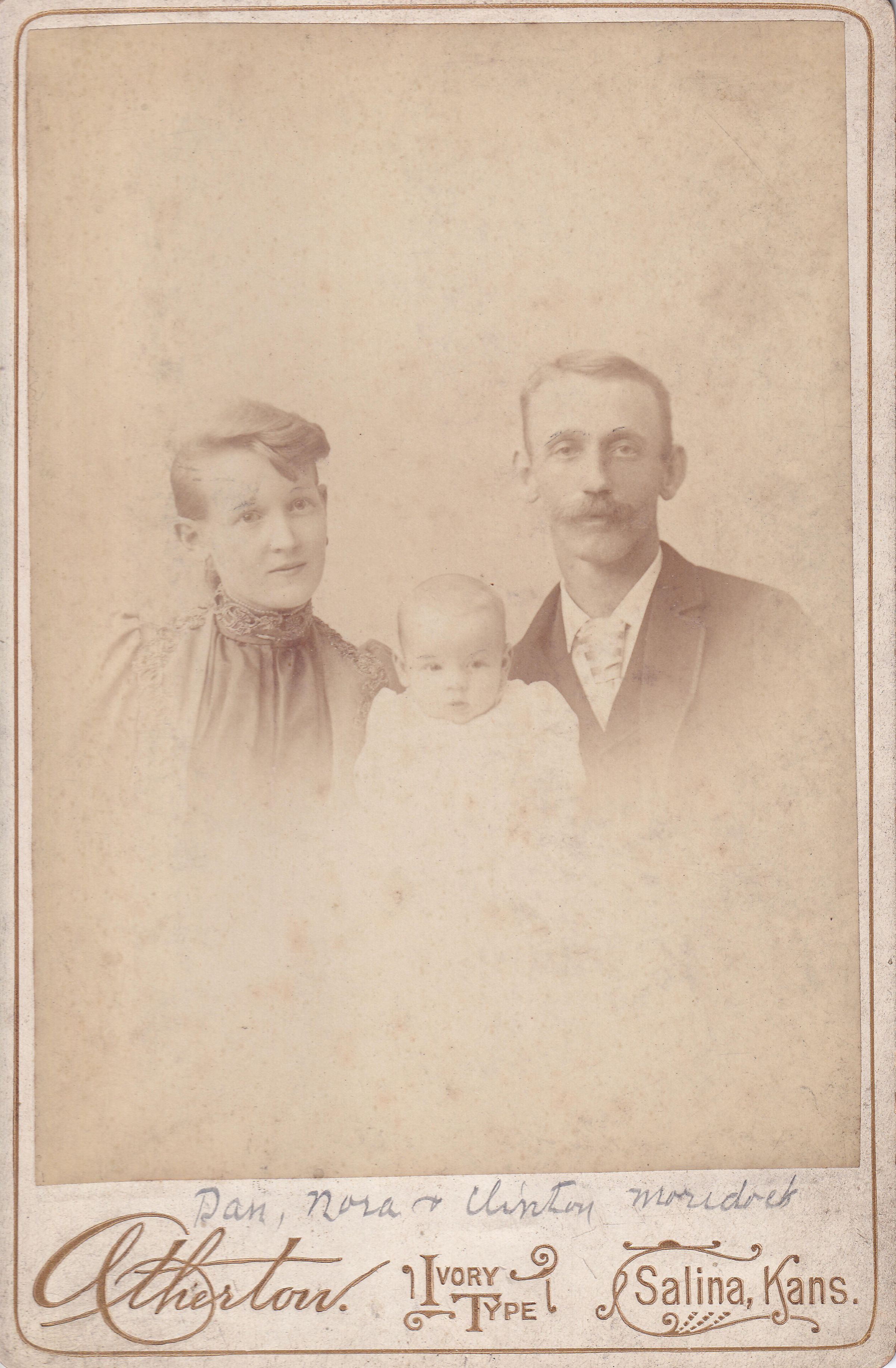 SOURCE CITATION: Ammons-Moredock Album 02, Photo 17 - Daniel Moredock [1862-1949] and his first wife, Nora Harriet (Goslin) (Moredock) Sharpnack [1874-1967] with their son George Clinton Moredock [1893-1967]; circa 1890-1895, image by H. M. Atherton, Salina, Kans.; item no. MORE-AN003-0017, Ammons-Moredock Collection, Greene Connections Archives Project (www.GreeneConnections.com).