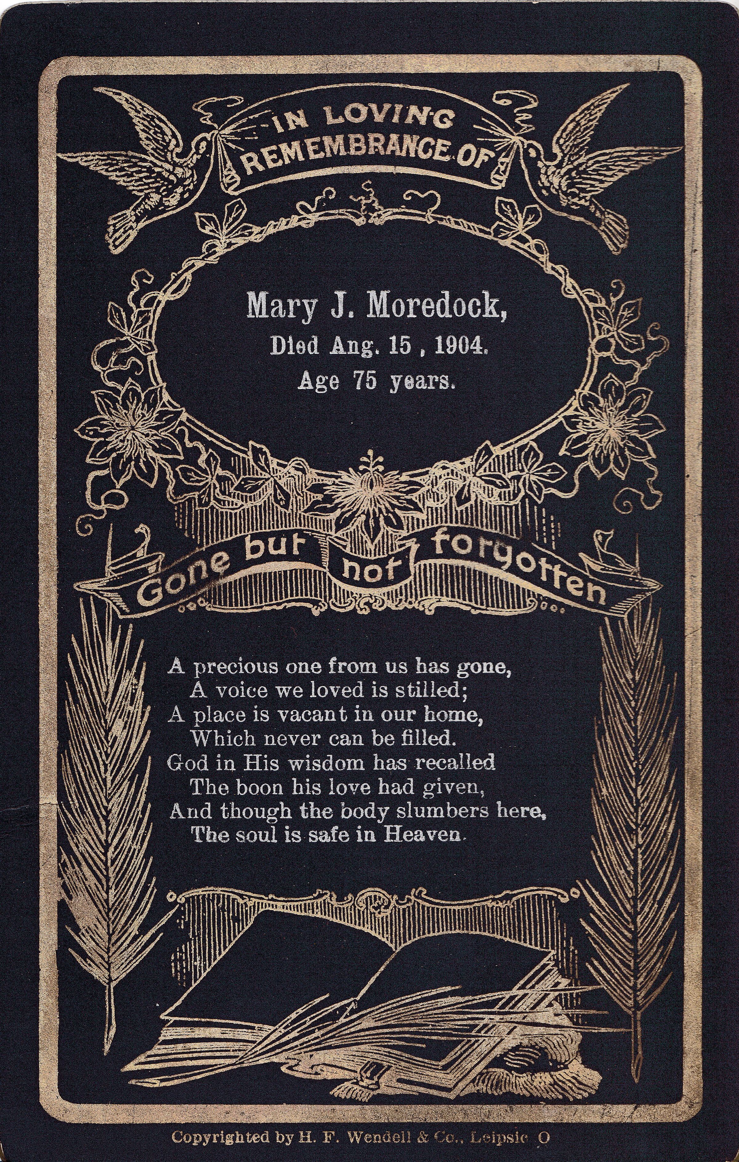 SOURCE CITATION: Ammons-Moredock Album 02, Photo 24 - Funeral card of Mary Jane (Reynolds) Moredock [1830-1904]; printed by H. F. Wendell & Co., Leipsic, Ohio; item no. MORE-AN003-0024, Ammons-Moredock Collection, Greene Connections Archives Project (www.GreeneConnections.com).