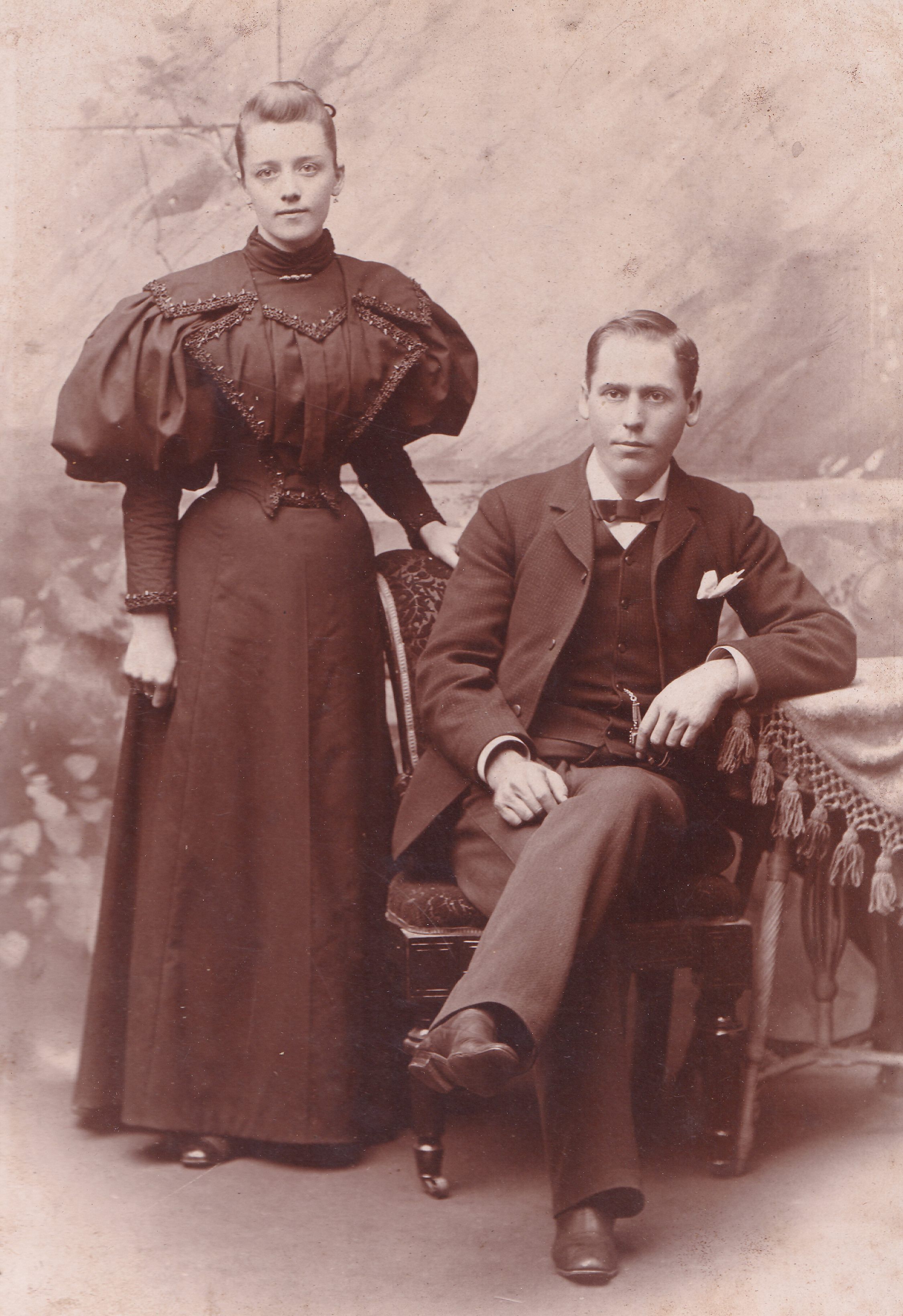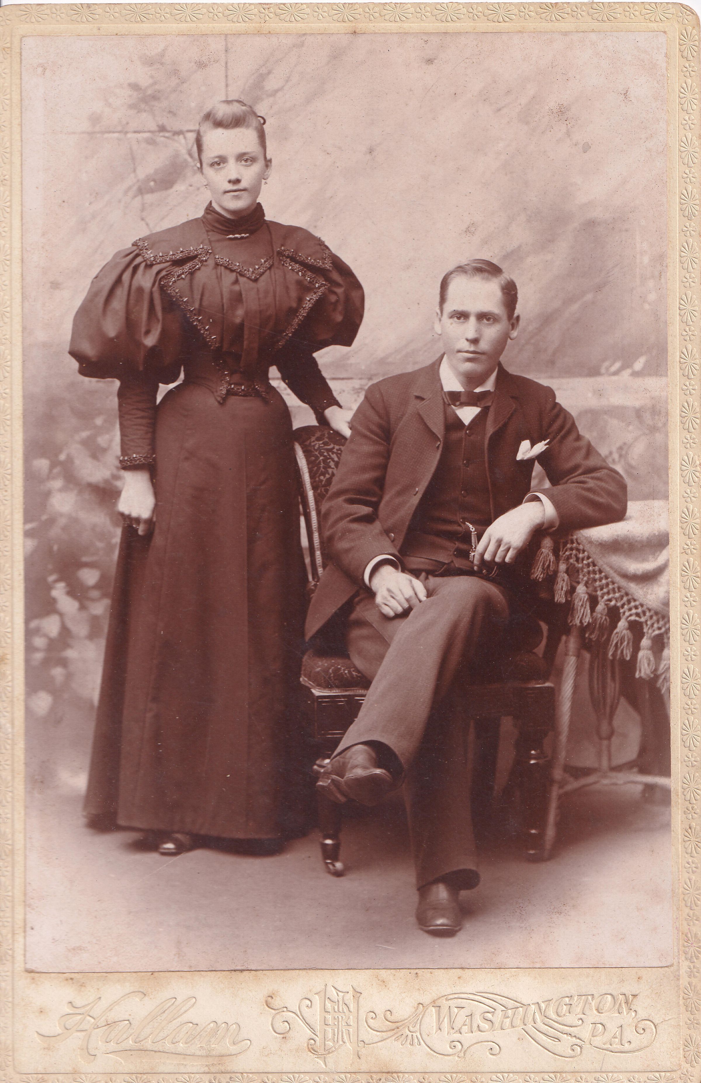 SOURCE CITATION: Ammons-Moredock Album 03, Photo 06 - Simon William Sharpnack [1868-1955] and his wife, Anna Bertha (Winget) Sharpnack [1872-1953]; circa 1890-1900, image by Hallam's Art Studio, Hallam Block, Washington, Pa.; item no. MORE-AN006-0006, Ammons-Moredock Collection, Greene Connections Archives Project (www.GreeneConnections.com).