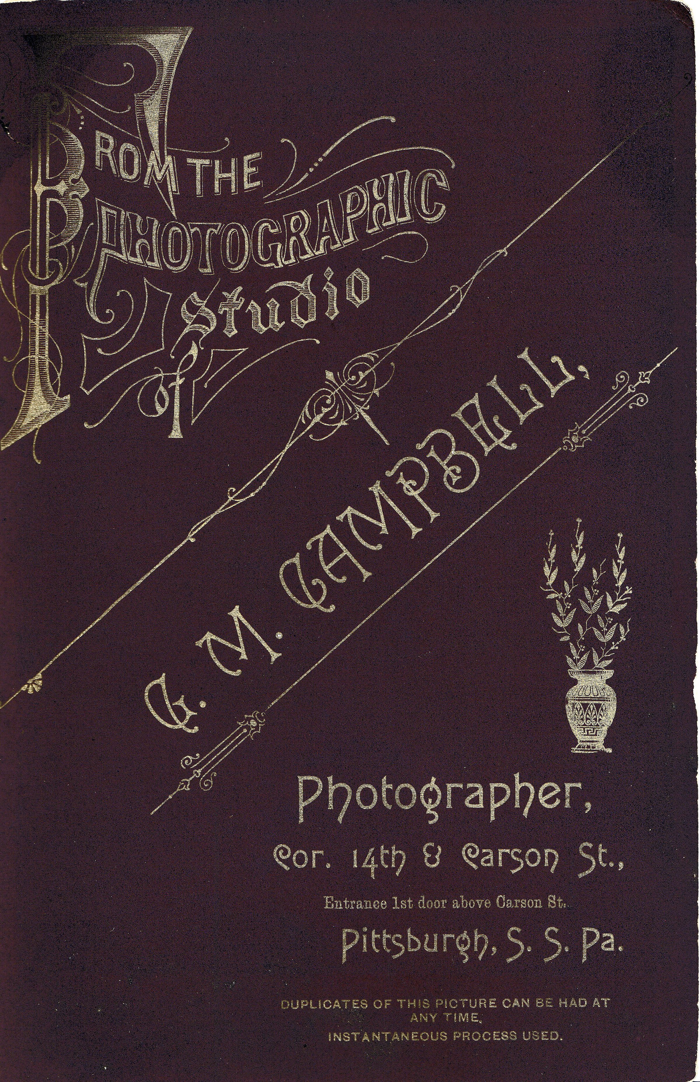 SOURCE CITATION: Ammons-Moredock Album 03, Photo 08; circa 1880-1900, image by G. M. Campbell, Cor. 14th & Carson St., South Side, Pittsburgh, Pa.; item no. MORE-AN006-0008, Ammons-Moredock Collection, Greene Connections Archives Project (www.GreeneConnections.com).