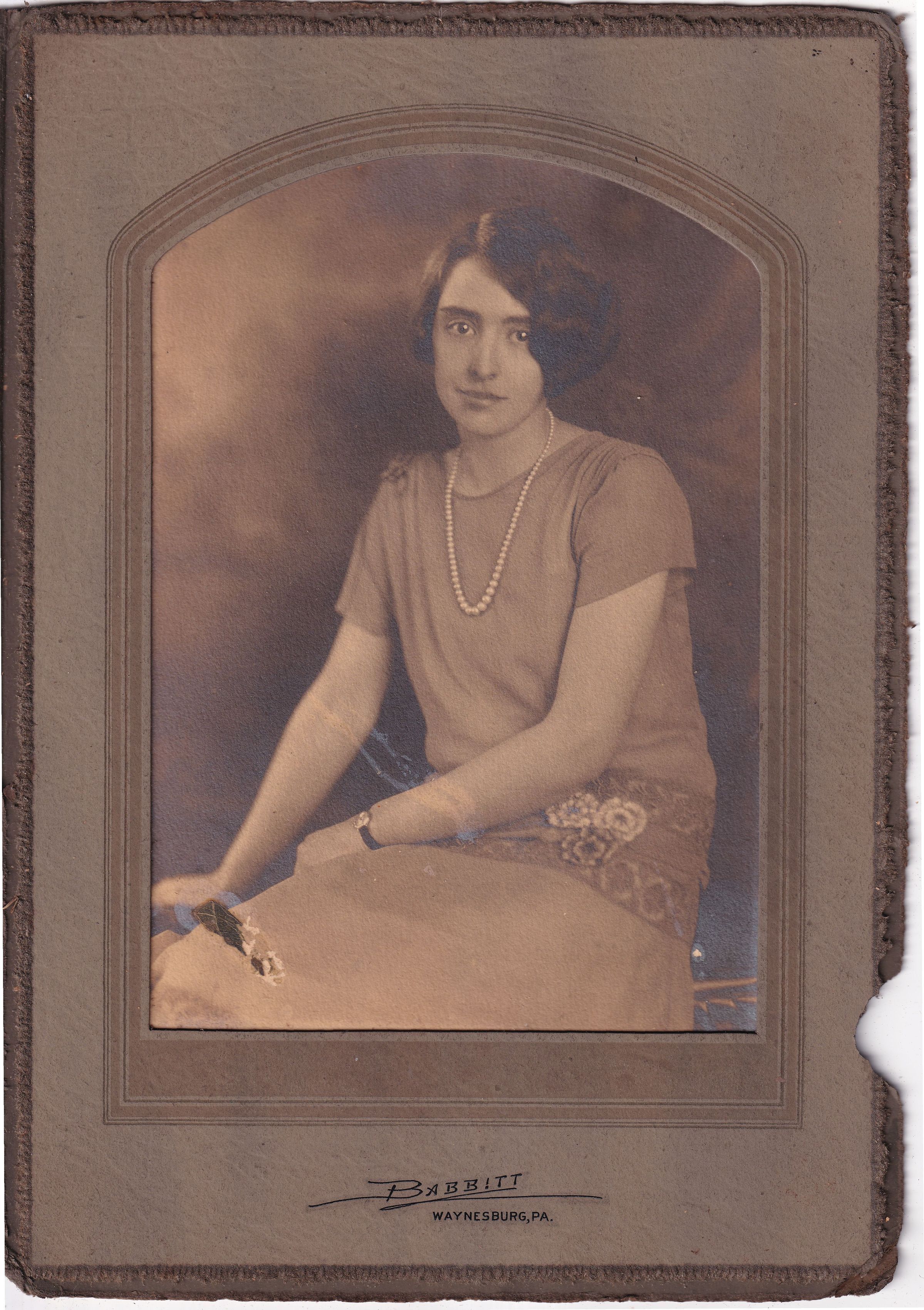 SOURCE CITATION: Anna Pauline (Cree) Schroyer [1909-1972]; circa 1925-1930, image by Babbitt, Waynesburg, Pa.; item no. MORS-AN004-0005, Cree Series, Ruth Cecilia (Morris) (Shultz) Minor Collection; Greene Connections Archives Project (GreeneConnections.com).