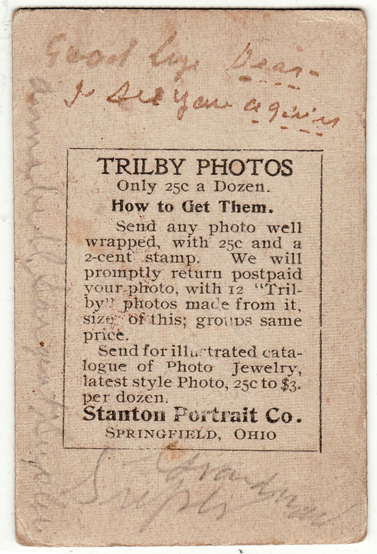 This photograph was reproduced circa 1905, by Stanton Portrait Co., Springfield, Ohio. They were not the original photographers. They advertise, "Trilby Photos, Only 25 [Cents] a Dozen. / How to Get Them. / Send any photo well wrapped, with 25 [Cents] and a 2-cent stamp. We will promptly return post-paid your photo with 12 Trilby photos made from it...."Photograph Details