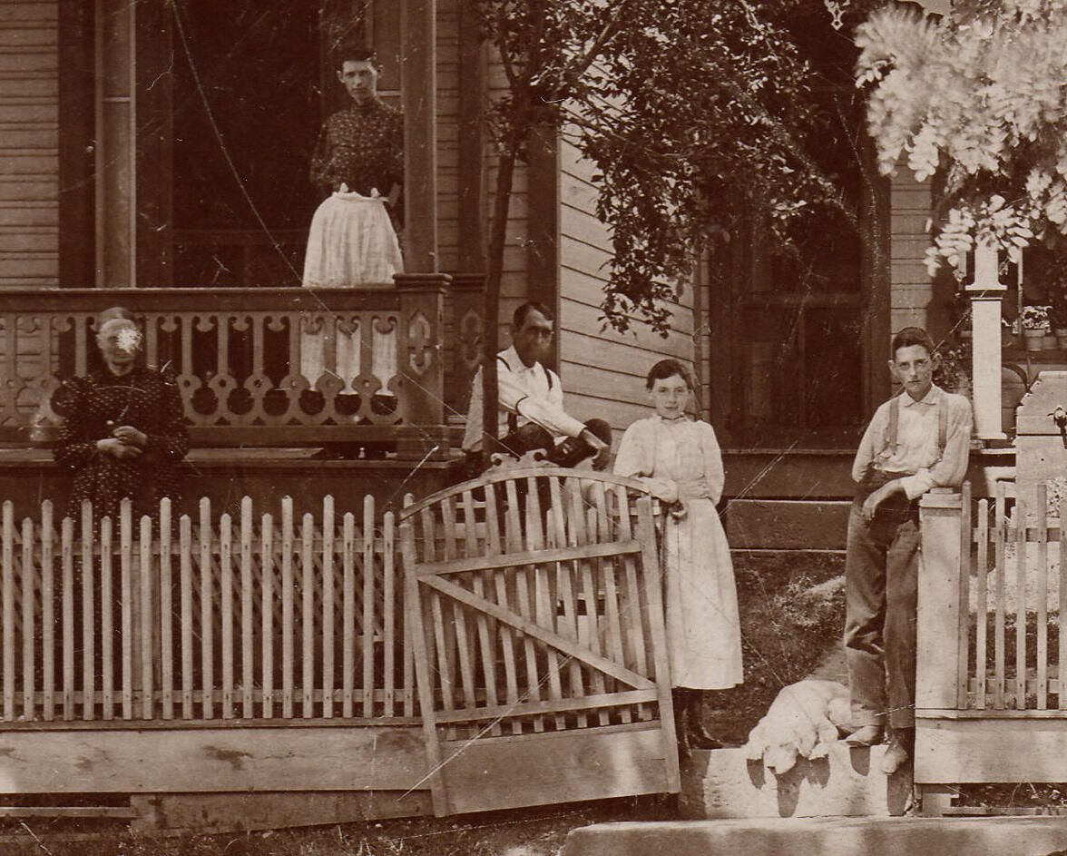 Mary Jane "Jennie" (Bane) Crayne - daughter of Nathaniel M. Bane and Mary McClenathan, standing on porch;