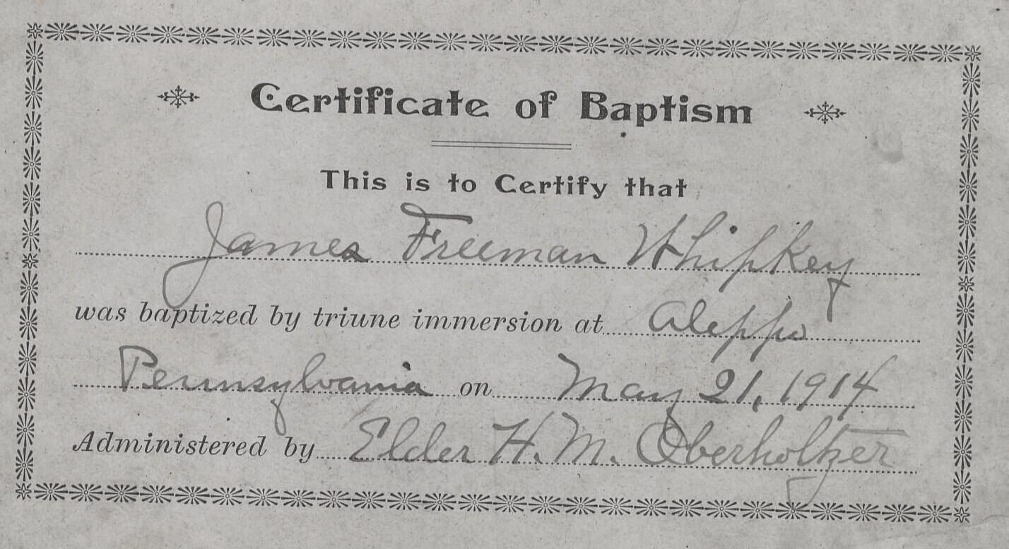 Dated 21 May 1914. Baptismal certificate of James Freeman Whipkey [1879-1967] - son of John Cramer Whipkey & Lydia Lohr. Issued by Elder H. M. Oberholtzer.