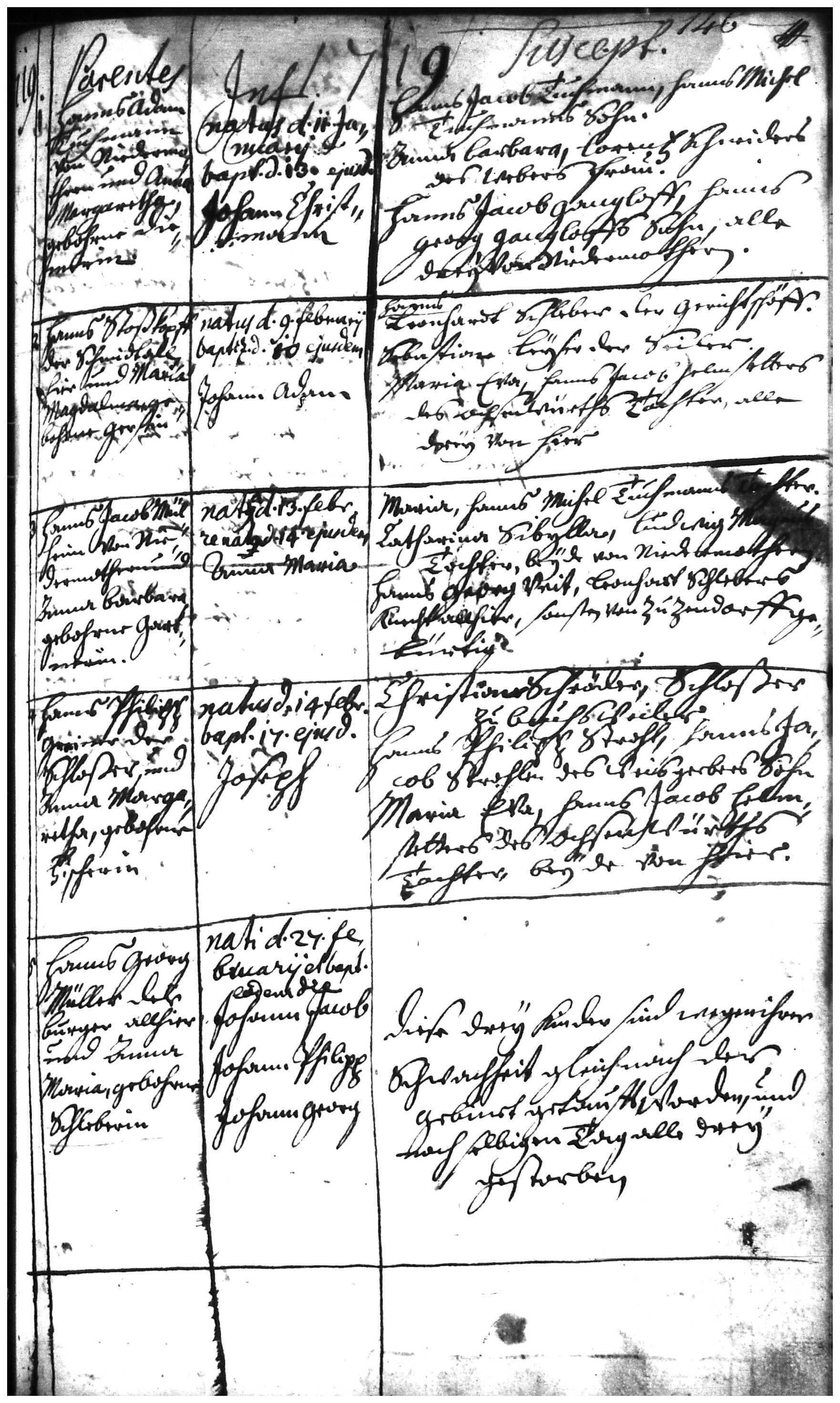 SOURCE: Evangelische Kirche Pfaffenhofen (Kr. Zabern) (Alsace, France), Kirchenbuch, page 146, no. 1, Johann Christmann Tuchmann birth and baptism; FHL microfilm 785827, 8 rolls.