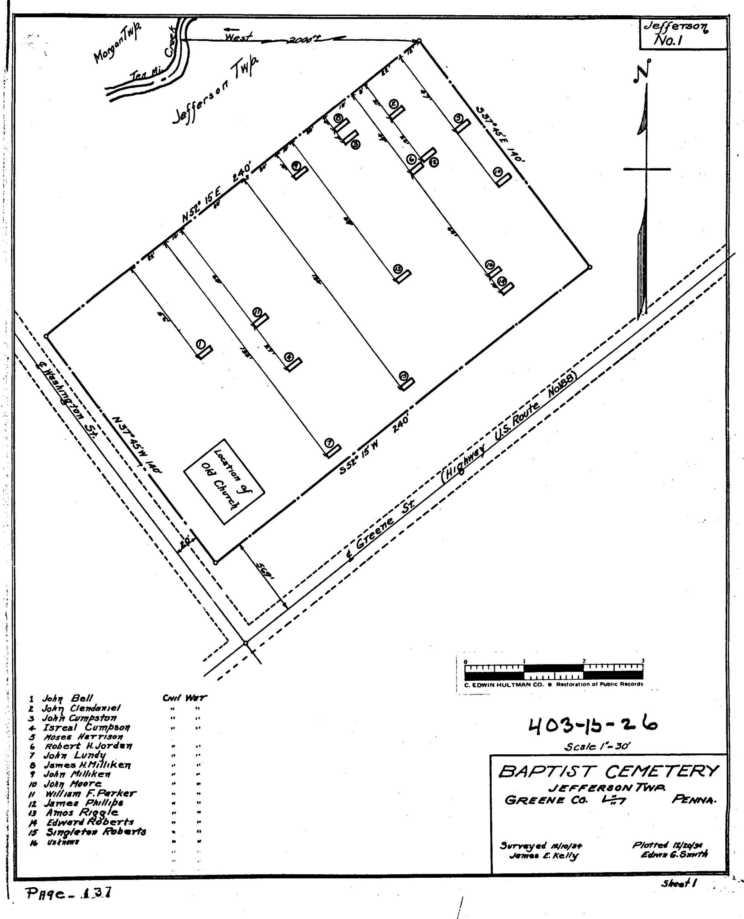 SOURCE CITATION: WPA Cemetery Plat - Pennsylvania - Greene County - Jefferson Township - Baptist Cemetery (1934); item no. 2016.3.382, Cemetery Plat (WPA) Collection, surveyed by Works Projects Administration, copy on file at the Clerk of Courts Office, Greene County Courthouse; Greene Connections Archives Project (GreeneConnections.com).