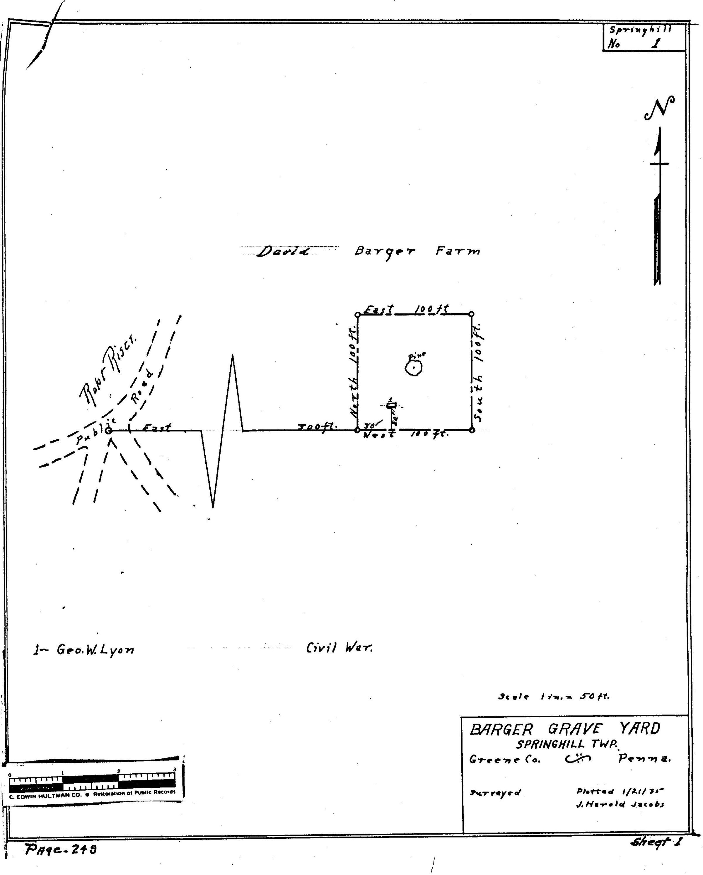 SOURCE CITATION: WPA Cemetery Plat - Pennsylvania - Greene County - Springhill Township - Barger Cemetery (1935), item no. 2016.3.236, Cemetery Plat (WPA) Collection, surveyed by Works Projects Administration, copy on file at the Clerk of Courts Office, Greene County Courthouse, Greene Connections Archives Project (GreeneConnections.com).