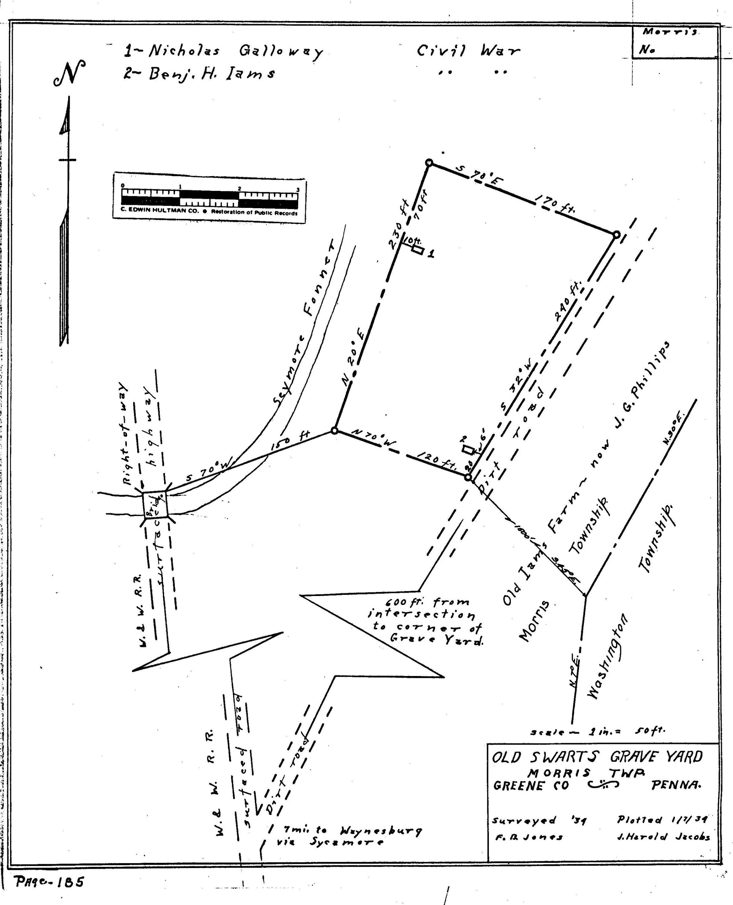 During the 1930s, the Works Progress Administration (renamed in 1939 as the Work Projects Administration) provided jobs by employing individuals to locate and map area cemeteries. As a part of these surveys, workers also listed veterans buried at each cemetery. The Clerk of Courts Office at the Greene County Courthouse in Waynesburg, Pennsylvania, holds one set of the plat maps copied from the originals created during this project. In 2019, these maps were subsequently scanned and researched for the Greene Connections: Greene County, Pennsylvania Archives Project.