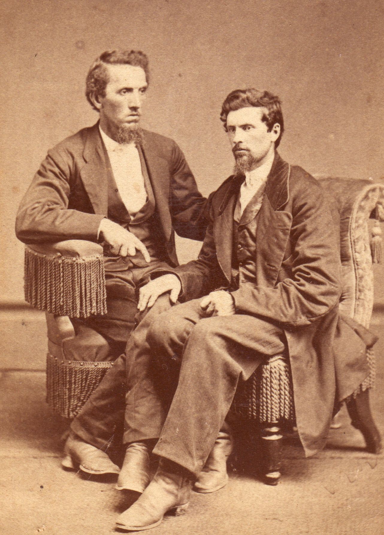 SOURCE CITATION: Rice-Fordyce Album 02, Photo 53 - [Left-Right]: Josephus Rice Jr. [1843-1916], Jacob Rice [1838-1929] - sons of Josephus Rice Sr. and Harriet Bodley; circa 1865-1875, image by S. G. Rogers, Waynesburg, Pa.; item no. RICE-AN001-0002-0053, John Robert Rice Collection, Greene Connections Archives Project (www.GreeneConnections.com).