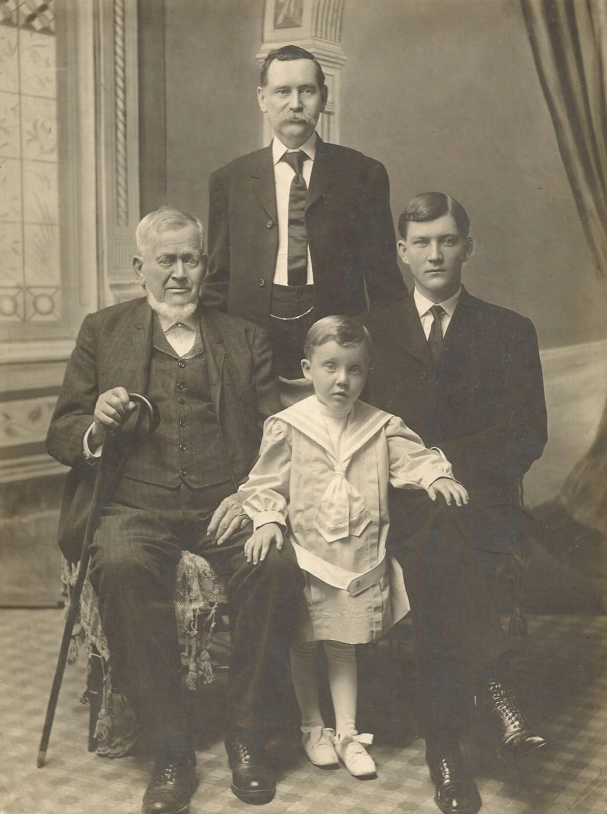 Source Citation: Call family - four generations, pictured [clockwise]: (1) James Call Jr., Esq. [1825-1907], (2) Harvey Call [1851-1924] oldest son of James, (3) Clyde Morris Call [1882-1948] son of Harvey, (4) Harvey Call II [1903-1925] son of Clyde Morris Call; circa 1903-1905; item no. MORR-AN001-0002, Lynne Gough Collection, Greene Connections Archives Project (www.GreeneConnections.com).