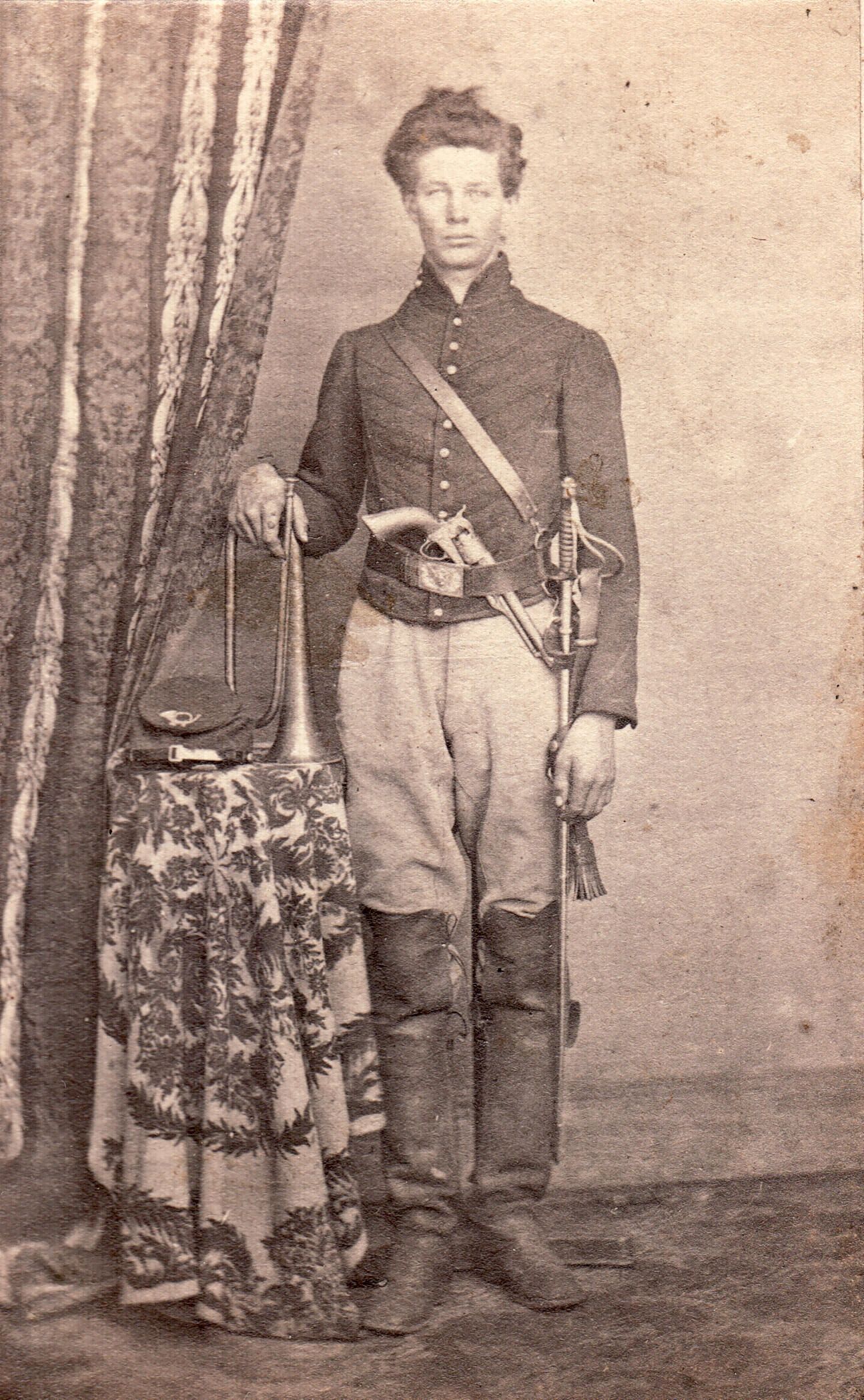 Carte-de-visite of William Harvey Crago [1843-1919], Bugler, Company D, 22nd Pennsylvania Cavalry Regiment, Civil War - son of John B. Crago and Eleanor Flenniken.