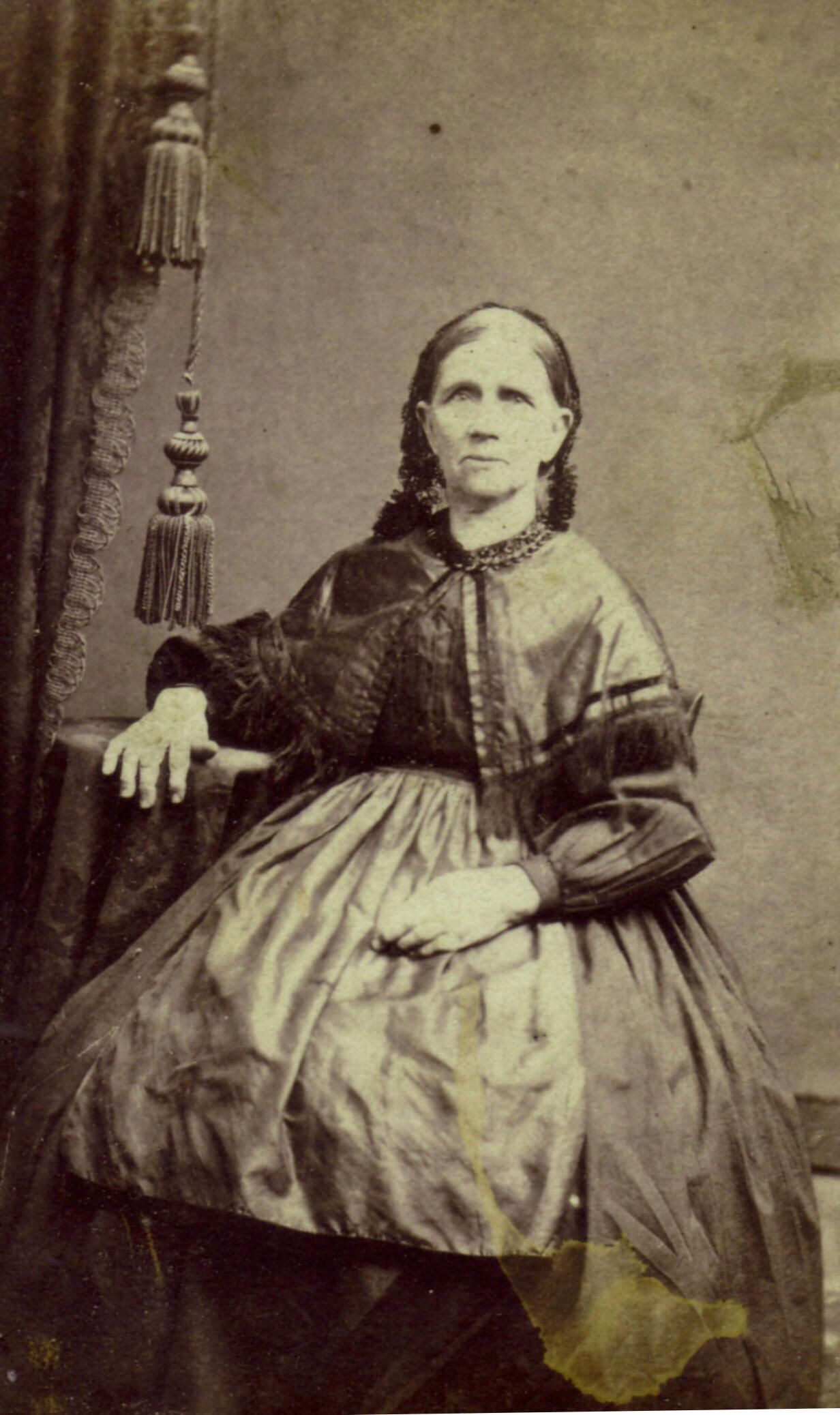 This CDV had been identified as Elizabeth (Barnes) Kent - wife of David Kent, daughter of William Barnes & Eleanor Ingersoll. However, further analysis of her age at the time of this image and comparison to another photograph of her, have led to the determination that she is not likely the subject of this image. Family resemblance and age-appropriateness have prompted the theory that this may instead be a photograph of her mother Eleanor (Ingersoll) Barnes.