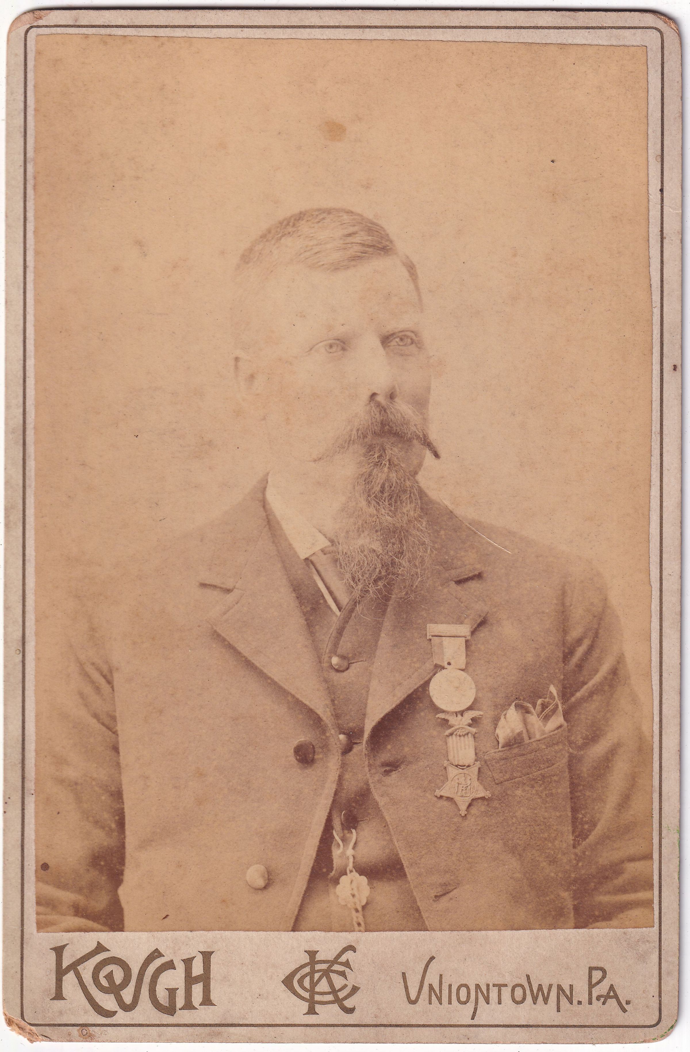 SOURCE CITATION: Believed to be James H. Fordyce [1842-1912] wearing a membership medal from the Grand Army of the Republic; circa 1890, image by Kough's Photographic Art Studio, Cor. Morgantown and Church Sts., Uniontown, Pa.; item no. MORS-AN005-0009, Miscellaneous Series, Ruth Cecilia (Morris) (Shultz) Minor Collection; Greene Connections Archives Project (GreeneConnections.com).
