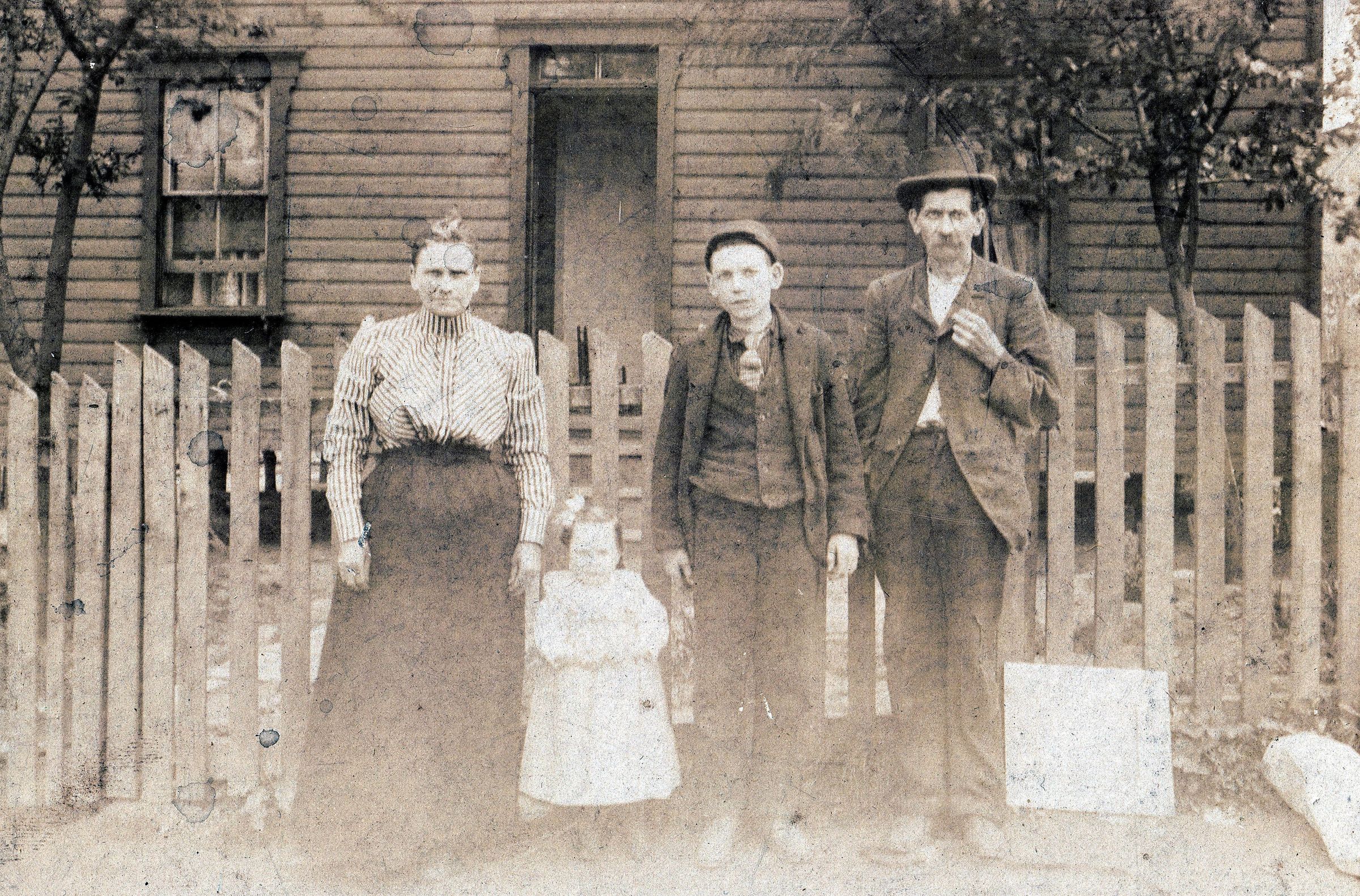Believed to be Oliver Jeremiah Price and Josephine (Minor) Price family, pictured [Left-Right]: Josephine (Minor) Price [1858-1913], Gertrude Lee (Price) (Fox) House [1887-1959], Walter Laidley Price [1882-1962], Oliver Jeremiah Price [1858-1929].