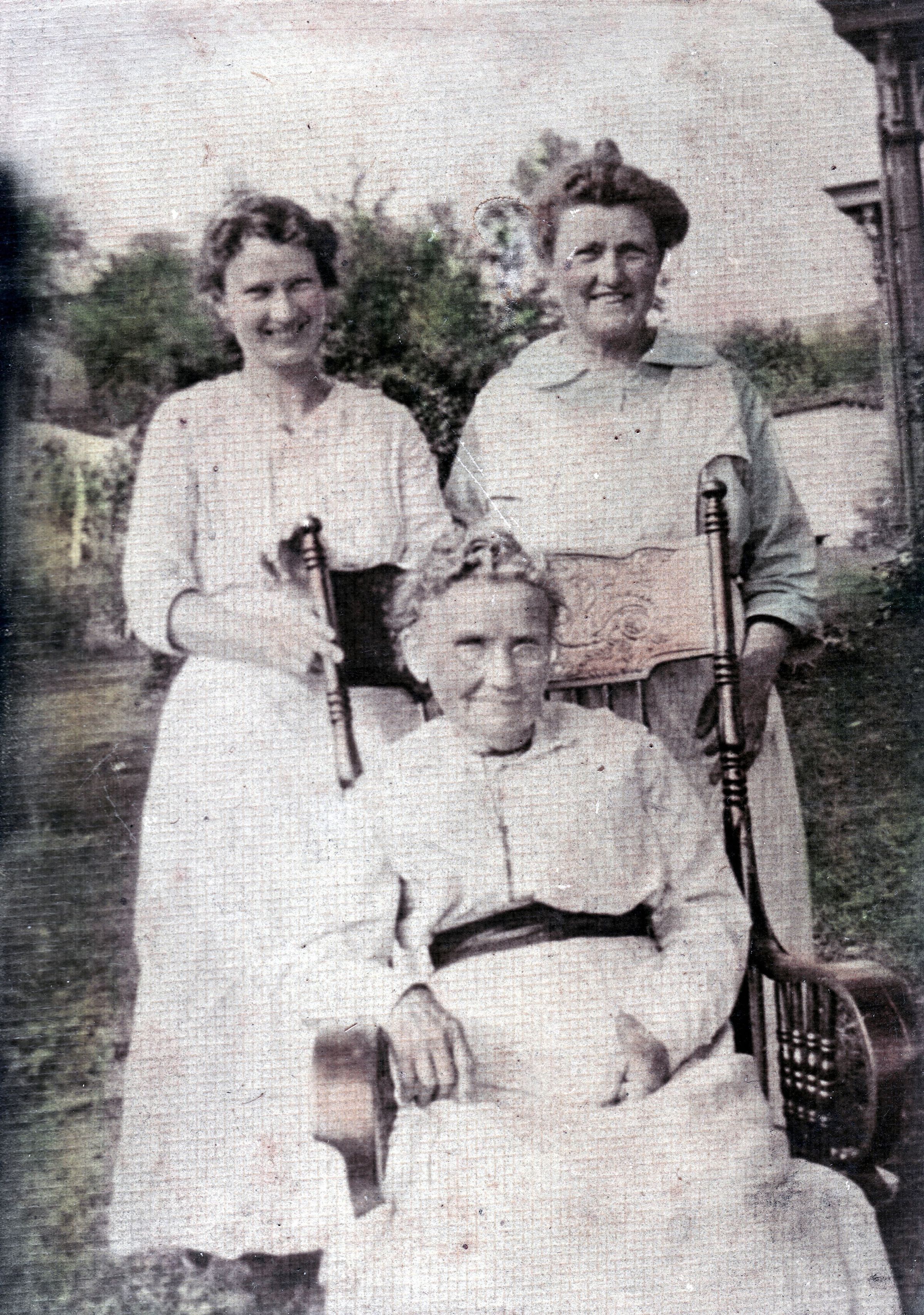 SOURCE CITATION: BACK - Mary Lenora "Lee" (Willison) (Hopkins) Stockdale [1887-1973], Ella May (Crouse) Willison [1865-1929], FRONT - Mary Elizabeth “Ma” (Bennett) Crouse [1845-1926]; circa 1925; item no. BOWL0020, Willison Series, Ella Ruth (Bowler) Turner Collection; Greene Connections Archives Project (GreeneConnections.com).