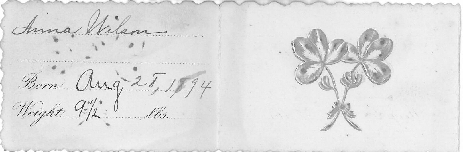 Source Citation: Birth announcement of Anna Wilson "Ann" (Miller) Beyer [1894-1975], item no. BEYE-AN001-0000A, Harold Frederic Beyer and Anna Wilson (Miller) Beyer Collection, shared by Harold Frederic Beyer III, Greene Connections Archives Project (www.GreeneConnections.com).