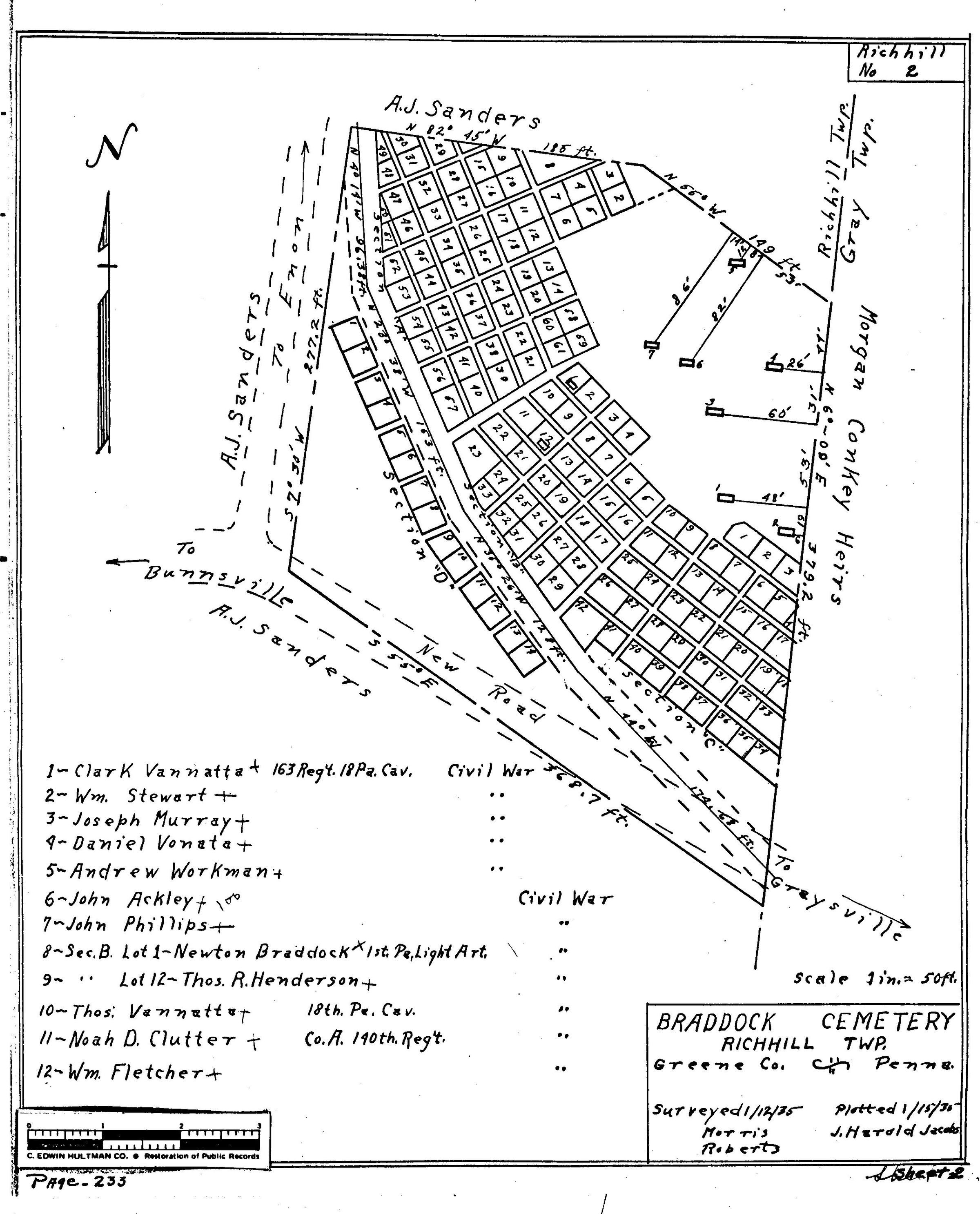 SOURCE CITATION: WPA Cemetery Plat - Pennsylvania - Greene County - Richhill Township - Braddock Cemetery II (1935); item no. 2016.3.299, Cemetery Plat (WPA) Collection, surveyed by Works Projects Administration, copy on file at the Clerk of Courts Office, Greene County Courthouse; Greene Connections Archives Project (GreeneConnections.com).