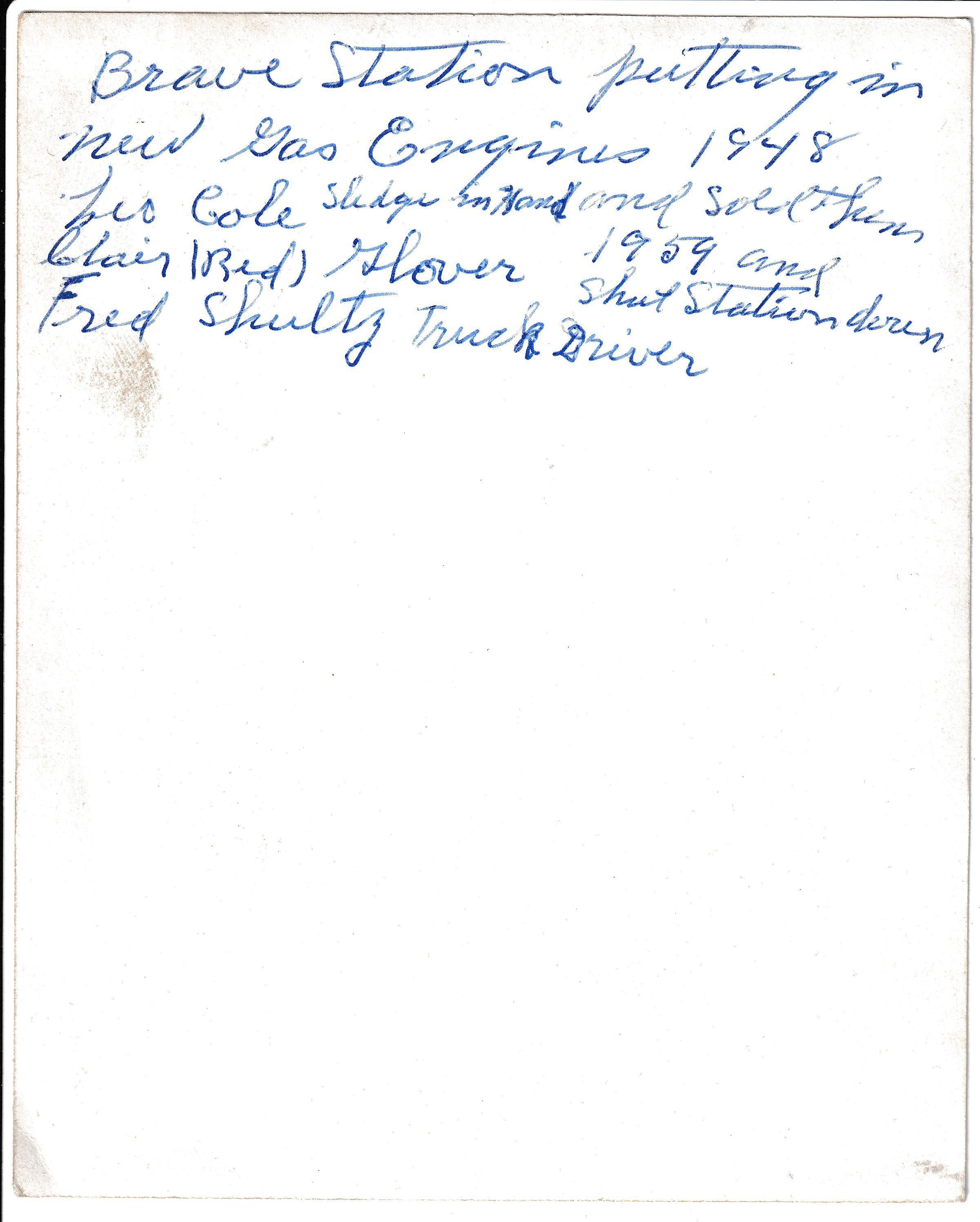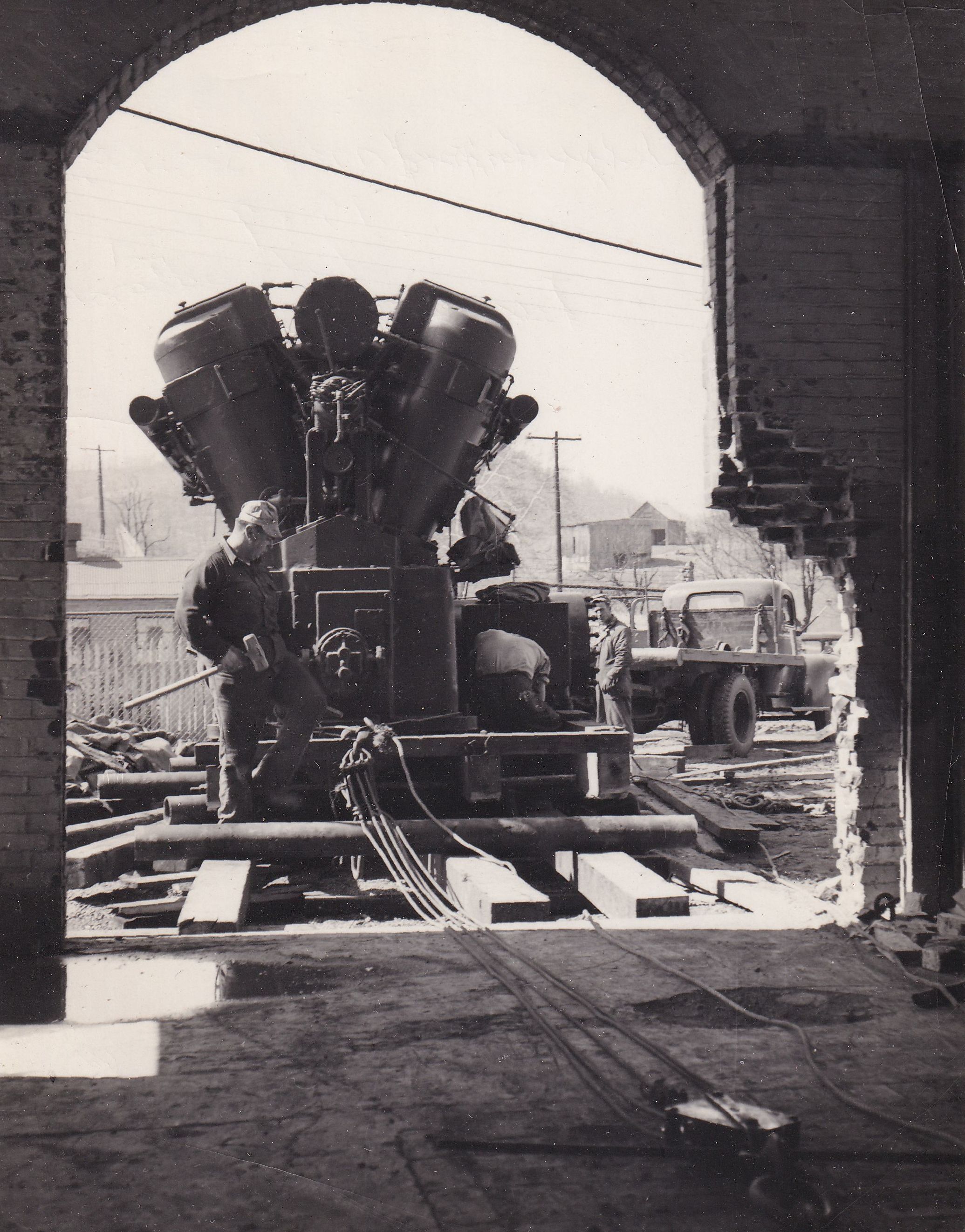SOURCE CITATION: Installing new gas engines at Brave Pumping Station in Brave, Wayne Township, Greene County, Pennsylvania; dated 1948; item no. CMBL-AN004-0005-0006, George Lindsey Cole Series, Matt W. Cumberledge Collection; Greene Connections Archives Project (GreeneConnections.com).