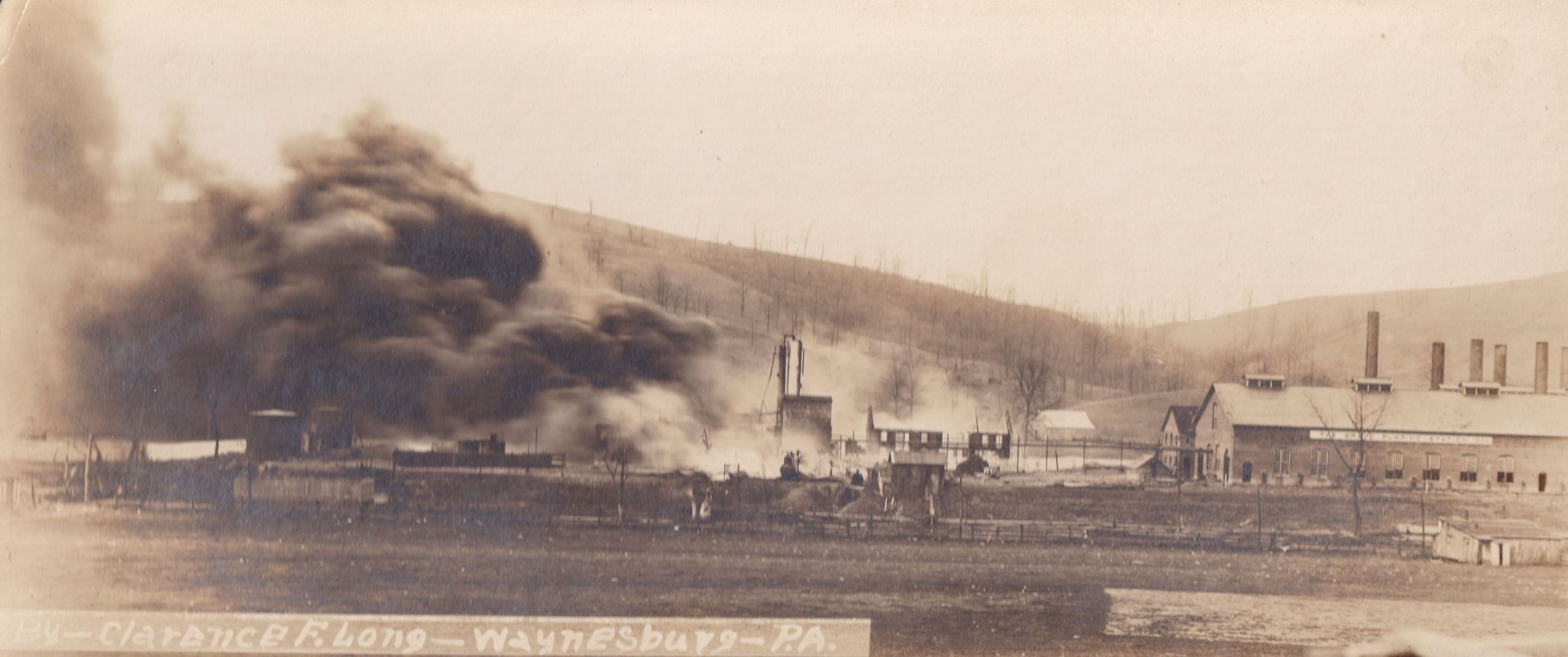 SOURCE CITATION: Brave Pumping Station, owned by the Peoples Natural Gas Company (PNGC), in Brave, Greene County, Pennsylvania, suffered a major explosion that took the lives of six workers on 2 April 1917; image by Clarence F. Long, Waynesburg, Pa.; item no. CMBL-AN004-0005-0001, George Lindsey Cole Series, Matt W. Cumberledge Collection; Greene Connections Archives Project (GreeneConnections.com).