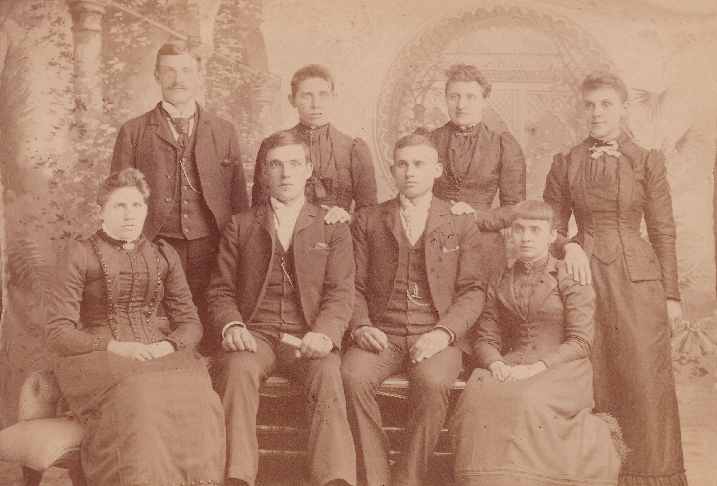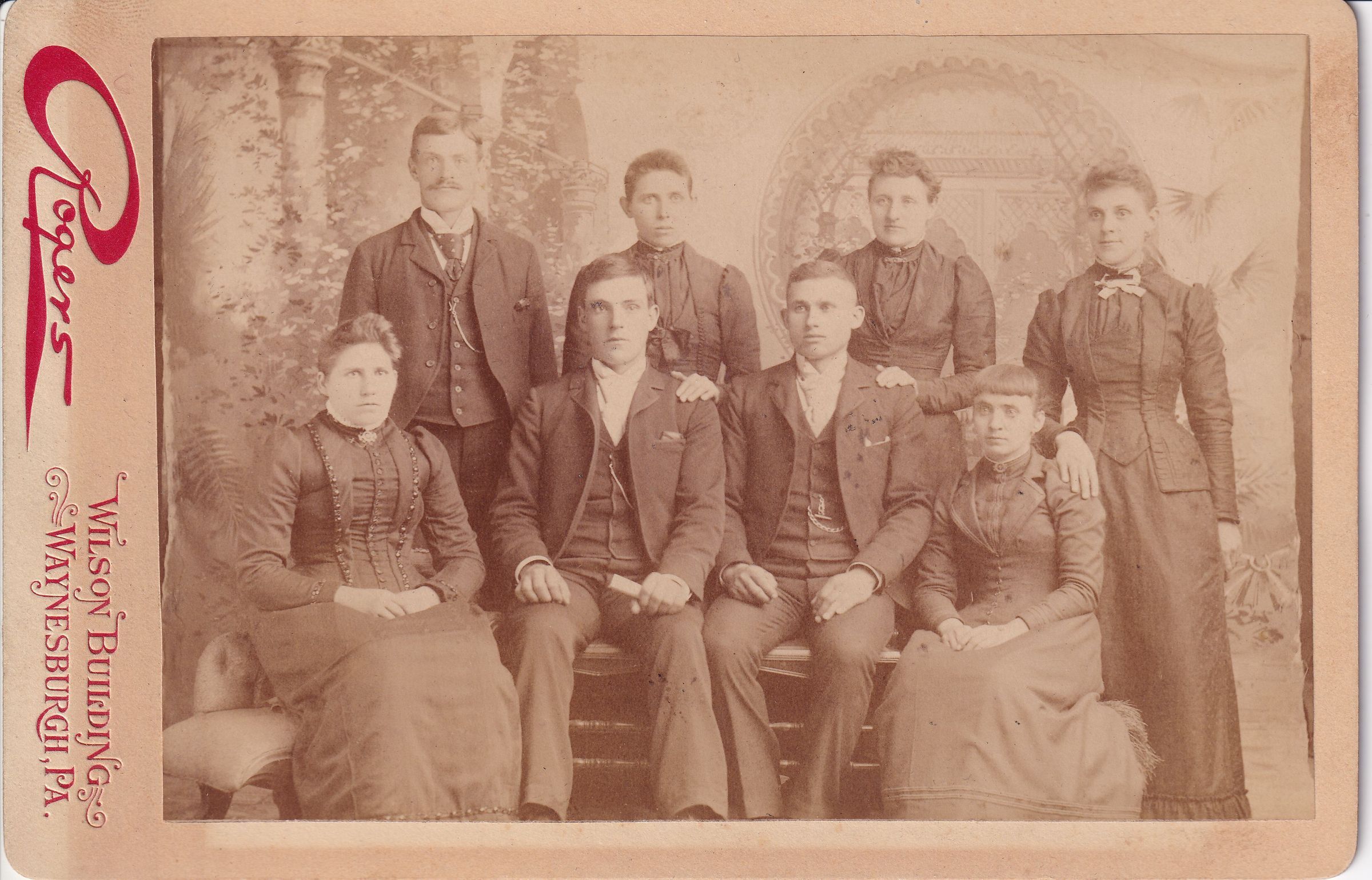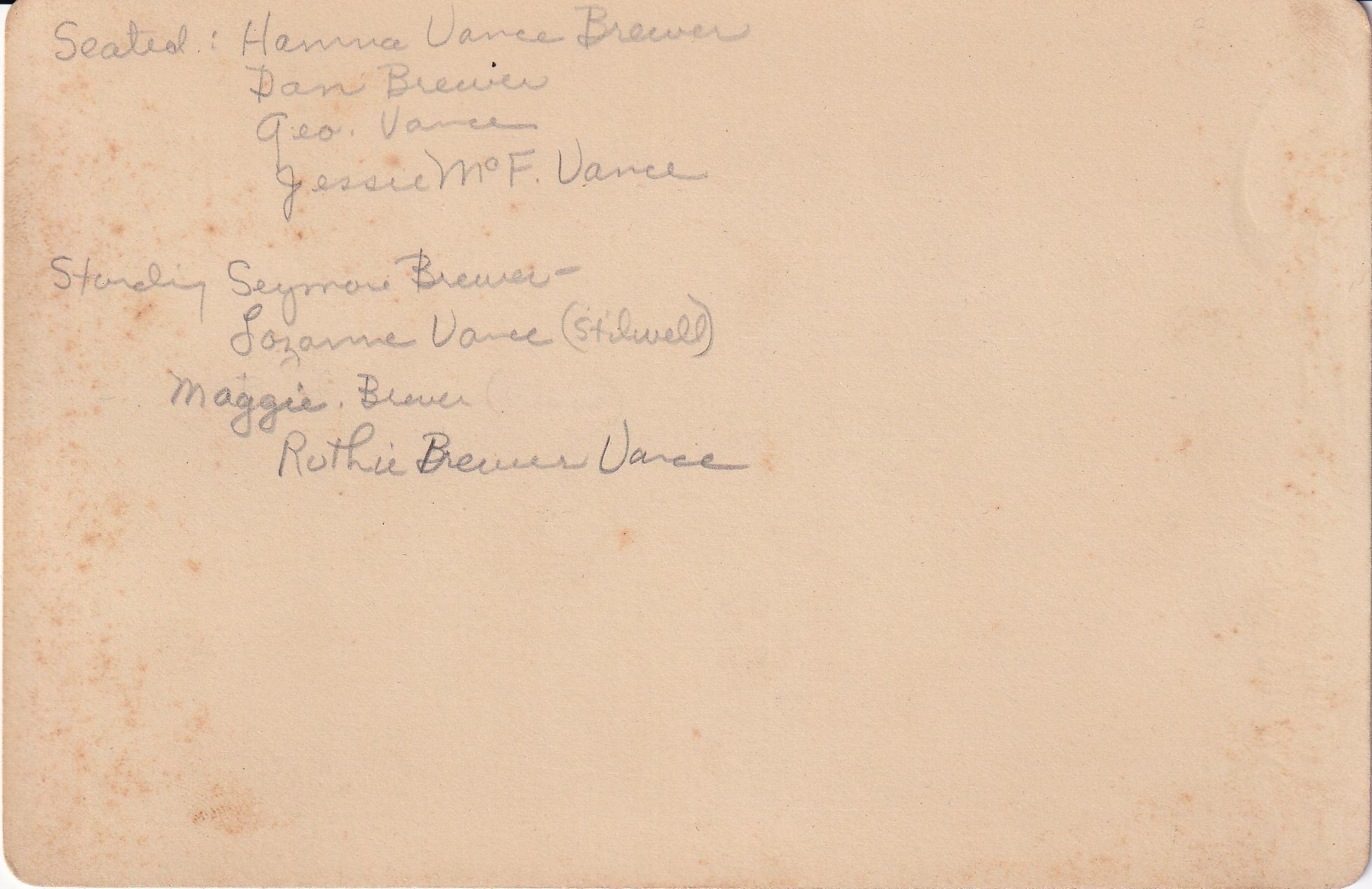 SOURCE CITATION: Brewer and Vance families, pictured [Left-Right]: STANDING - Amos Seymour Brewer [1868-1937], Lozann (Vance) Stilwell [1863-1927], Maggie Brewer, Ruth (Brewer) Vance [1865-1935]; SEATED - Hannah Jane (Vance) Brewer [1865-1893], Daniel Webster Brewer [1870-1938], George Birch Vance [1870-1928], Jessie Dell (McFarland) Vance [1868-1935]; circa 1892, image by Rogers, Wilson Building, Waynesburgh, Pa.; item no. MILB-AN001-0006-0007, Vance Series, Mary (Vance) McCann Collection, shared by her grandson, William Marshall Miller; Greene Connections Archives Project (GreeneConnections.com).