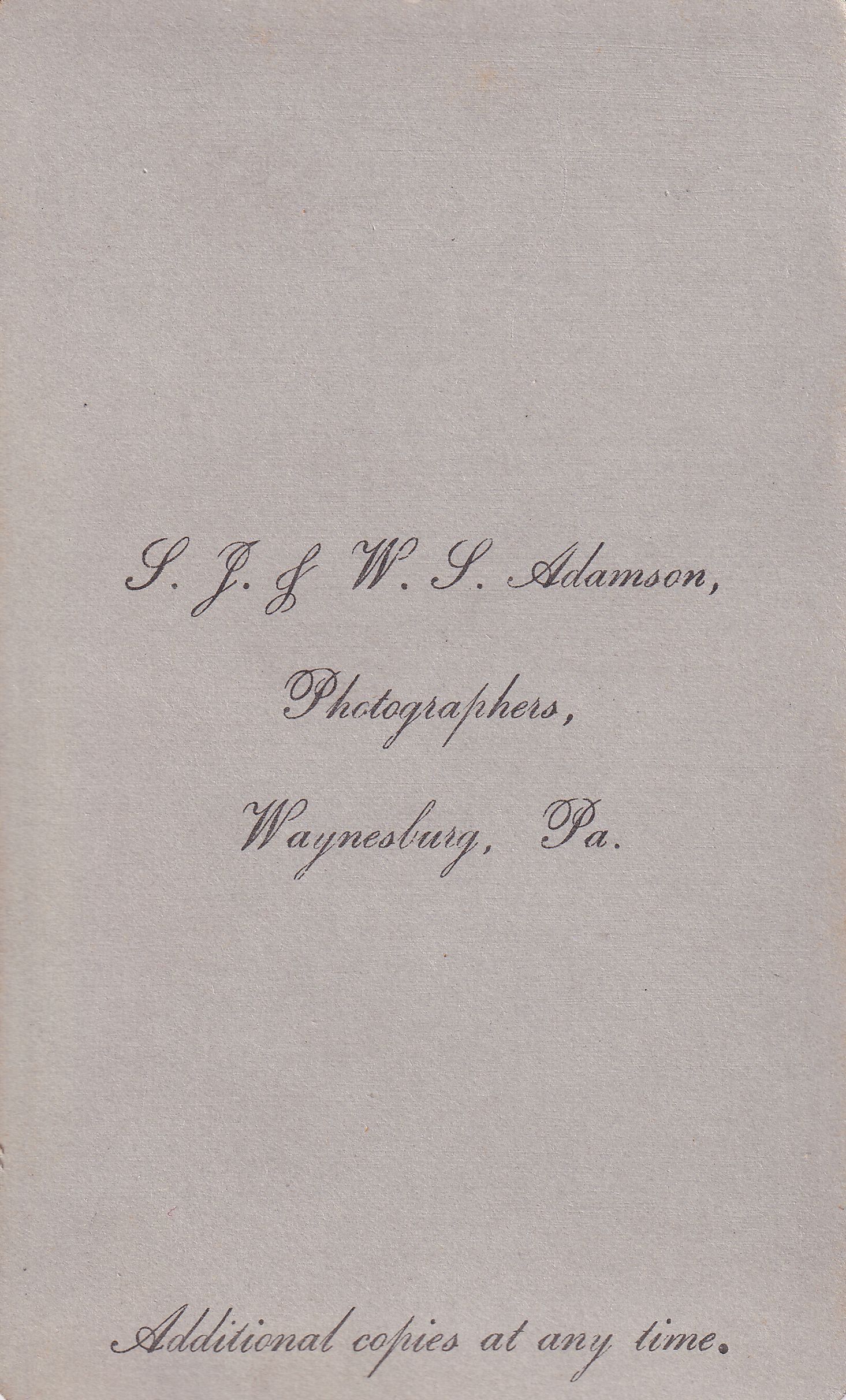 SOURCE CITATION: Phelan-Walker Album, Photo 40; circa 1870-1890, image by S. J. & W. L. Adamson, Photographers, Waynesburg, Pa.; item no. WAYN-AN008-0040, Waynesburg University Paul R. Stewart Museum Collection, Greene Connections Archives Project (www.GreeneConnections.com).