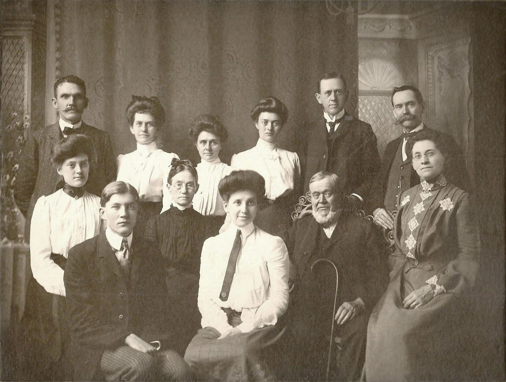 Source Citation: Call family. Pictured [Left-Right]: YOUNG COUPLE IN VERY FRONT ROW: Clyde Morris Call [1882-1948], Clara (Martin) Call [1884-1956]; MIDDLE ROW: Martha (Call) Ross [1871-1968], Martha (Van Wey) Call [1833-1923], James Call Jr. [1825-1907], Martha A. (Morris) Call [1855-1946]; BACK ROW: Zadok / William / or Robert Call, unknown Call, unknown Call, unknown Call, Zadok / William / or Robert Call, Harvey Call [1851-1924]; circa 1900-1905; item no. MORR-AN001-0001, Lynne Gough Collection, Greene Connections Archives Project (www.GreeneConnections.com).