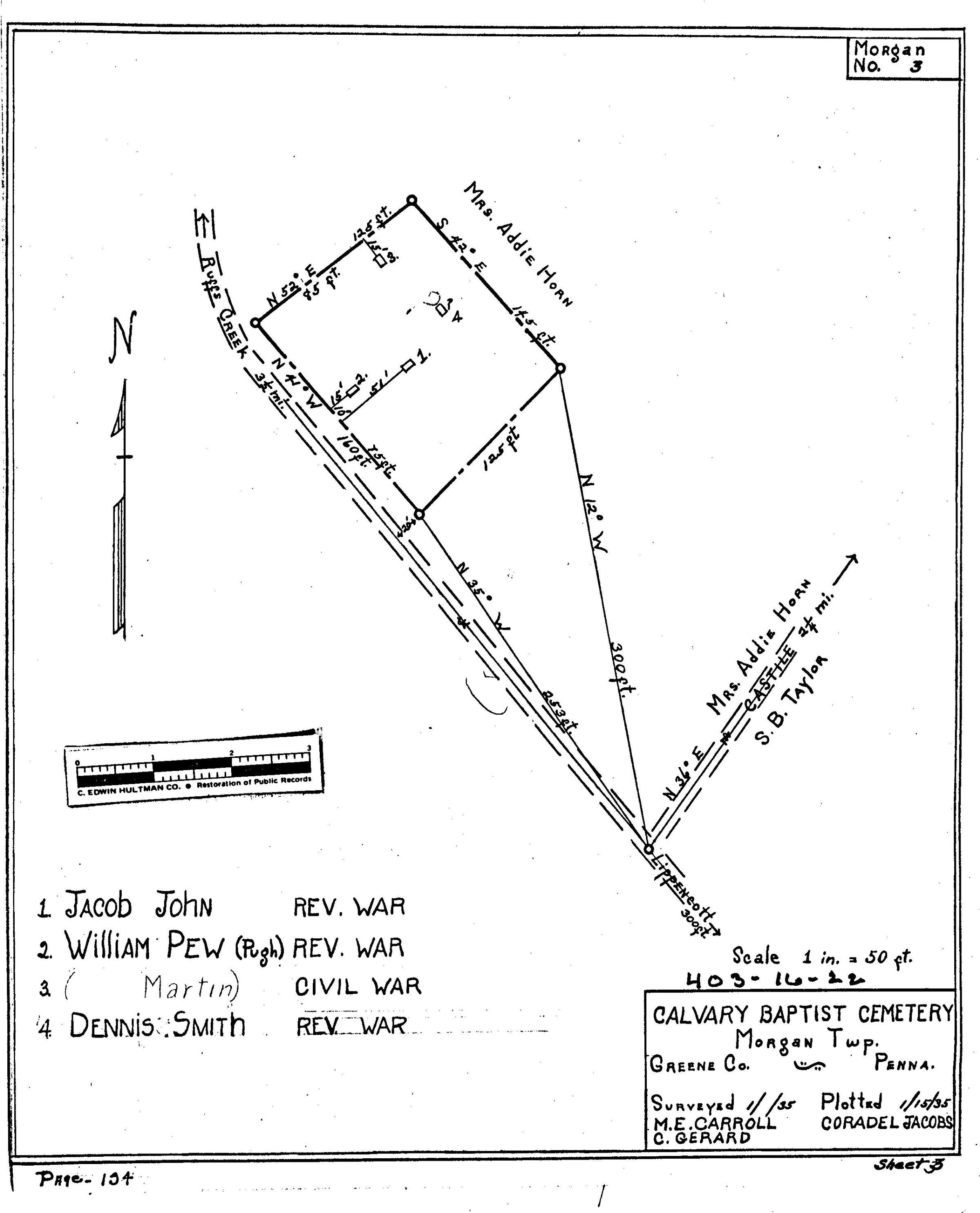 SOURCE CITATION: WPA Cemetery Plat - Pennsylvania - Greene County - Morgan Township - Calvary Baptist Church Cemetery (1935), item no. 2016.3.253, Cemetery Plat (WPA) Collection, surveyed by Works Projects Administration, copy on file at the Clerk of Courts Office, Greene County Courthouse, Greene Connections Archives Project (GreeneConnections.com).