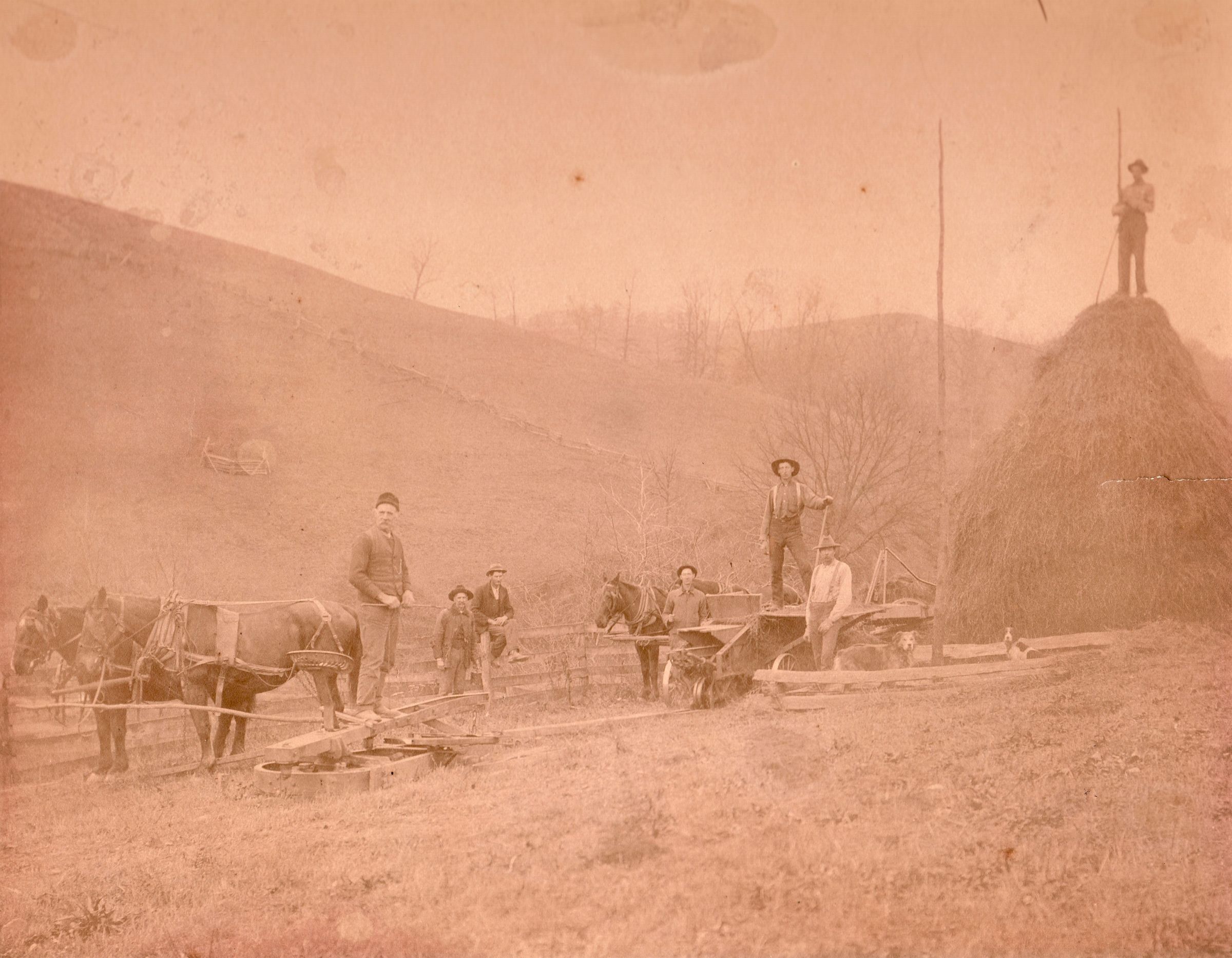 SOURCE CITATION: Carpenter family stacking hay in Greene County, Pennsylvania; circa 1880-1900; item no. CARP-AN005-0003, Sellers Burdette and Bettie (Blake) Carpenter Collection, shared by their heirs; Greene Connections Archives Project (GreeneConnections.com).