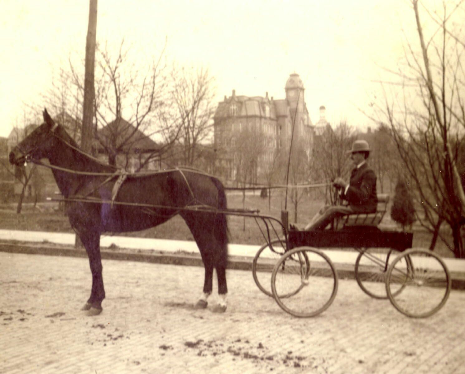Source Citation: Eleazer Luse Denny [1865-1910] riding north on Richhill Street in Waynesburg, Greene County, Pennsylvania; circa 1900-1910, image by Babbitt, Waynesburg, Pa.; item no. DENN-AN002-0010, Josephine Denny Collection, shared by Farley Toothman; Greene Connections Archives Project (GreeneConnections.com).