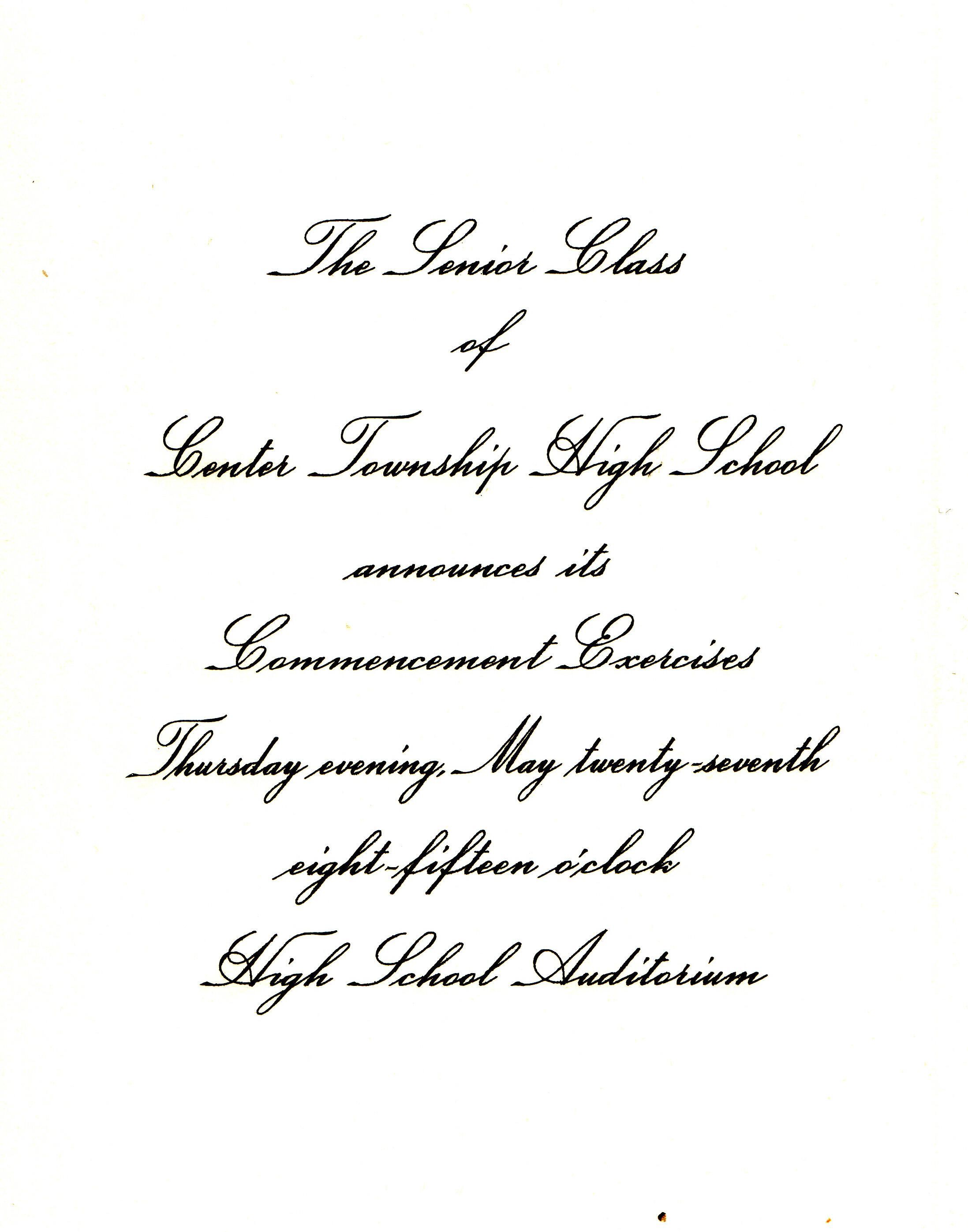 Dated 27 May 1954. Center Township High School graduation announcement.