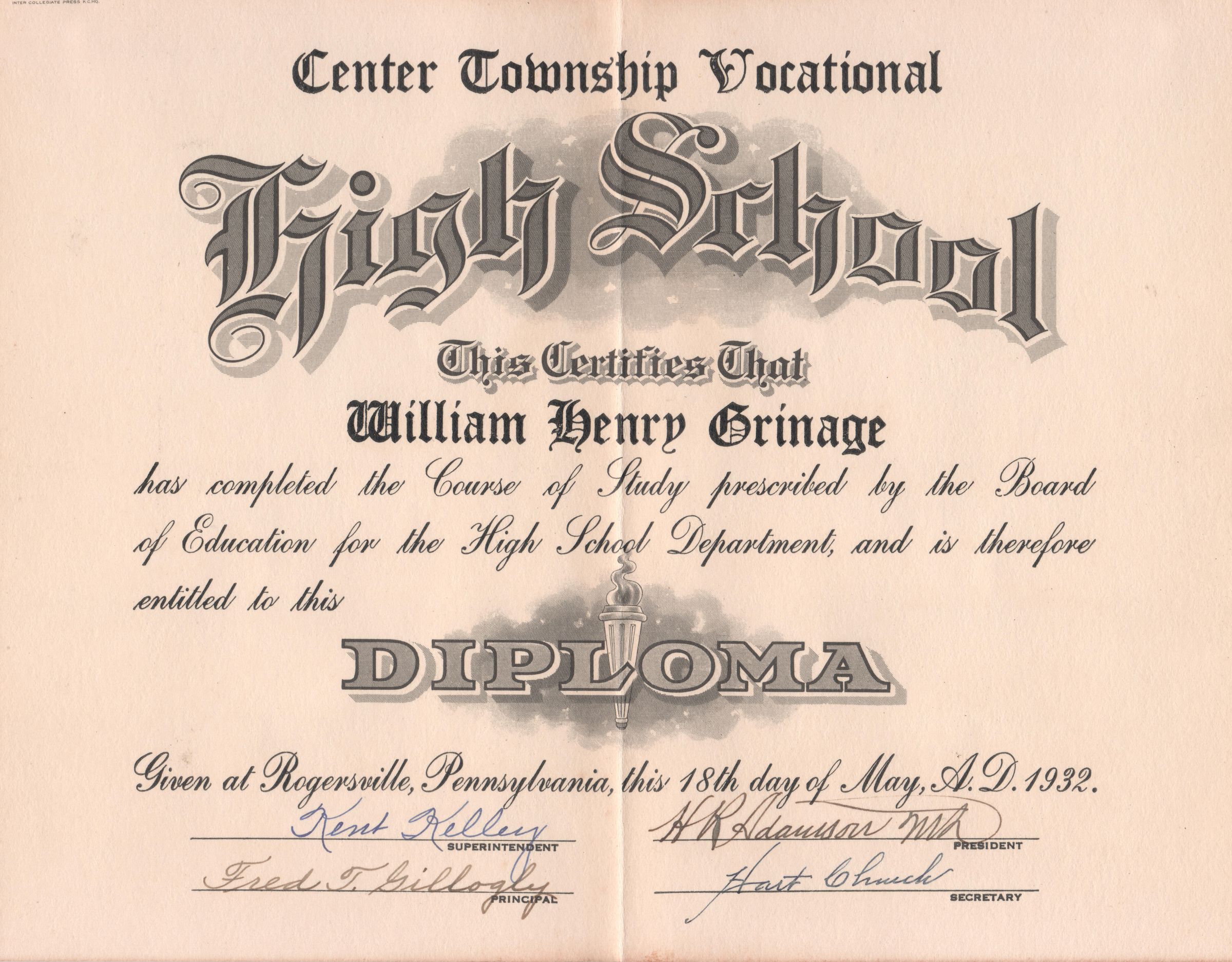Source Citation: Center Township Vocational High School Diploma - William Henry Grinage (Class of 1932), item no. HOLB-AN002-0002-0003, Holbrook Christian Church Collection, shared by Ross Smith, Greene Connections Archives Project (www.GreeneConnections.com).