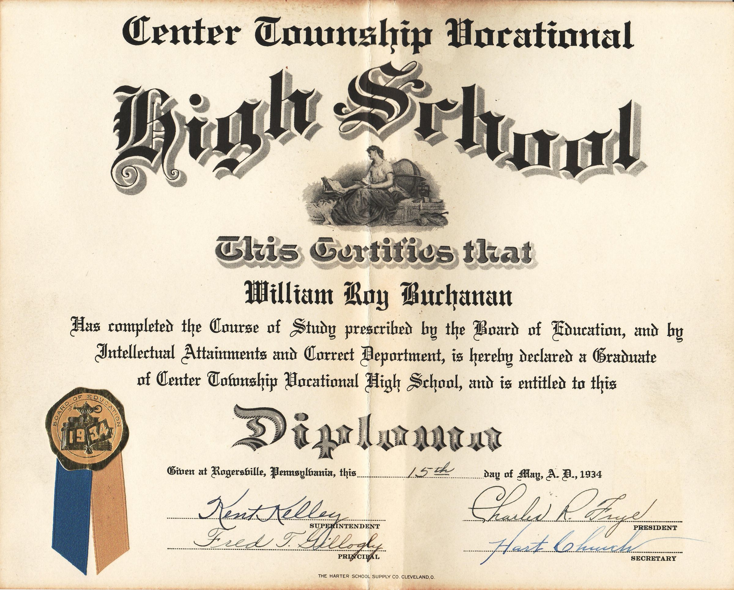 Center Township Vocational High School Diploma - William Roy Buchanan (Class of 1934).