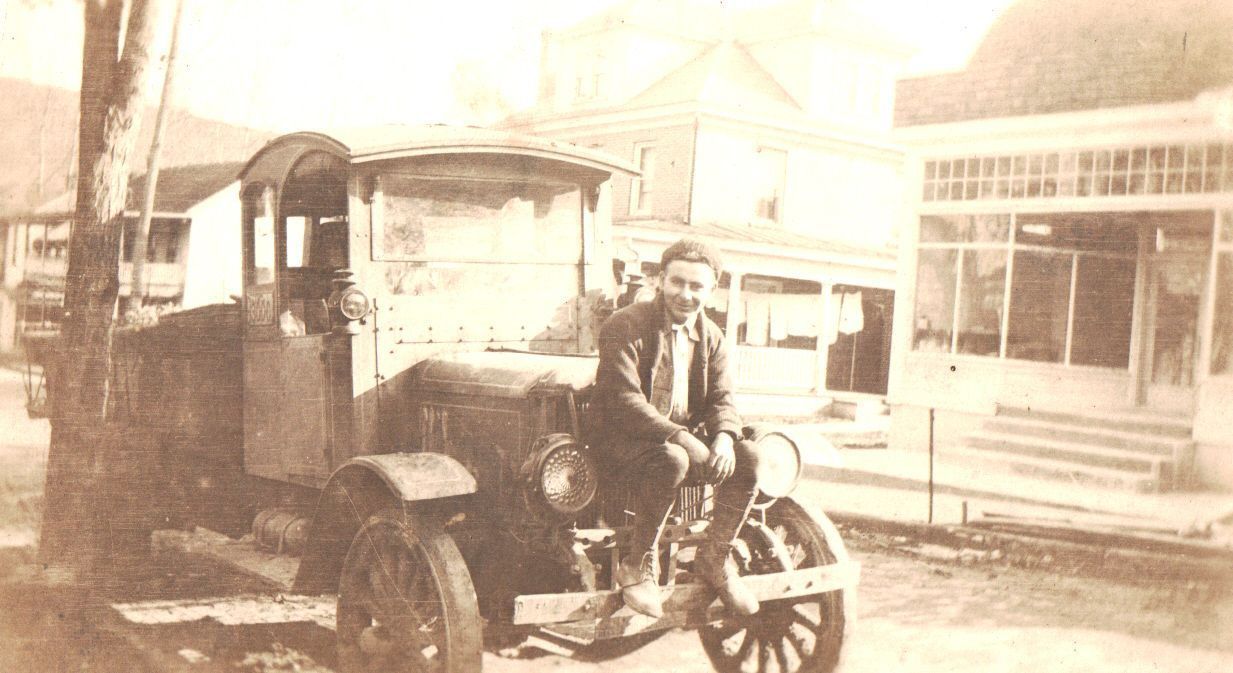 SOURCE CITATION: Clarence Ross Stewart seated on an automobile in Rogersville, Center Township, Greene County, Pennsylvania; circa 1940-1950; item no. CARP-AN006-0038, Sellers Burdette and Bettie (Blake) Carpenter Collection, shared by their heirs; Greene Connections Archives Project (GreeneConnections.com).