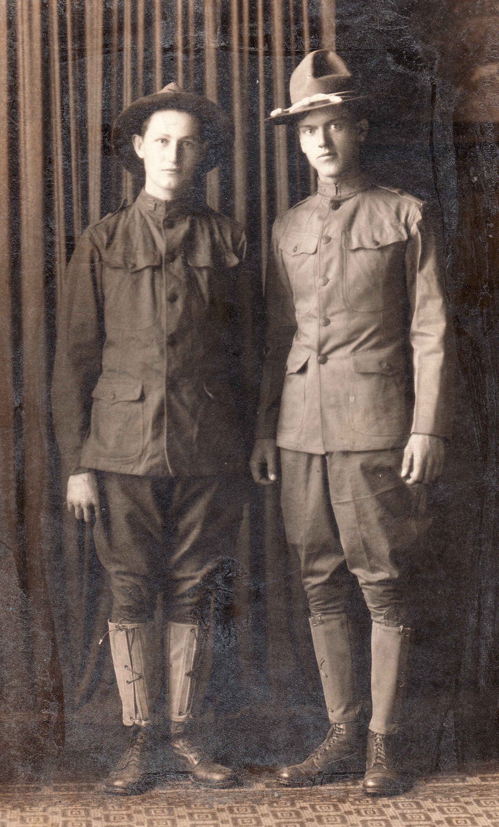 SOURCE CITATION: [Left-Right]: Clarence Sprowls and James Hobart Swart - both men were members of Company K, 110th Infantry, 28th Division during World War I; circa 1917-1918; item no. SUPL-AN003-0018, Swart Series, Wayne Carl Swart Collection, Greene Connections Archives Project (www.GreeneConnections.com).