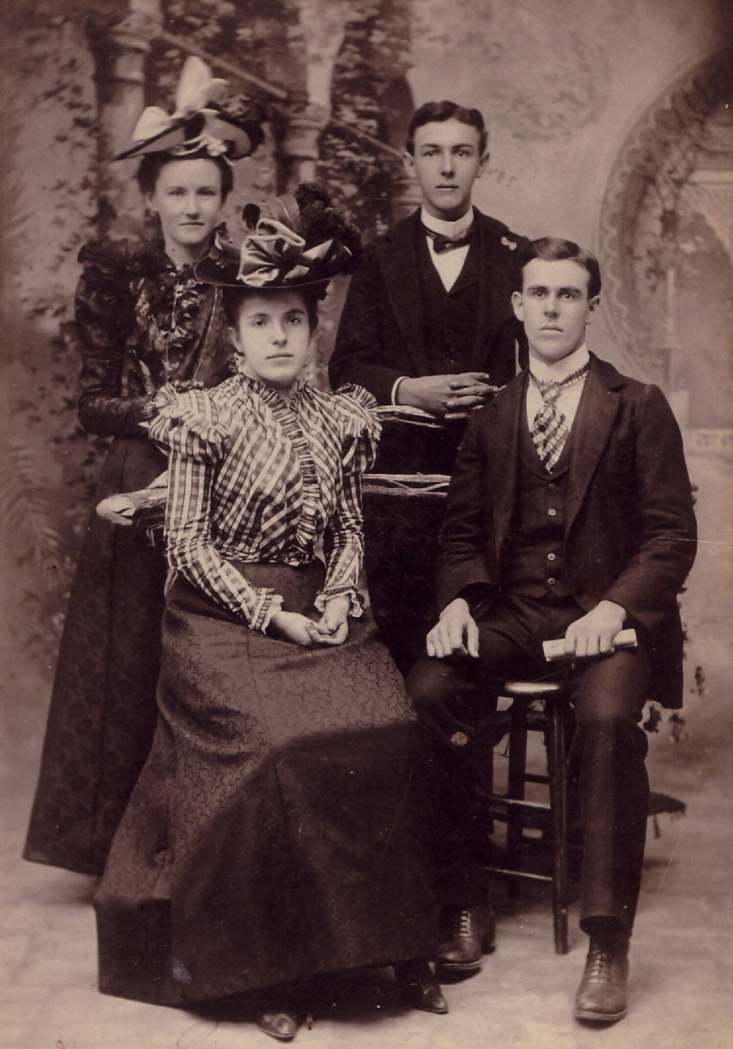 Source Citation: [Left-Right]: BACK - Mary Elizabeth "Lizzie" (Johnson) Knight and Edward Ray Knight; FRONT - Clara Mae (Knight) Clark and Silas Parry Clark; circa 1895-1905, image by Rogers Studio, Waynesburg, Pa.; item no. CAND_AN003_0005, Candice Lynn Buchanan Collection, Greene Connections Archives Project (www.GreeneConnections.com).