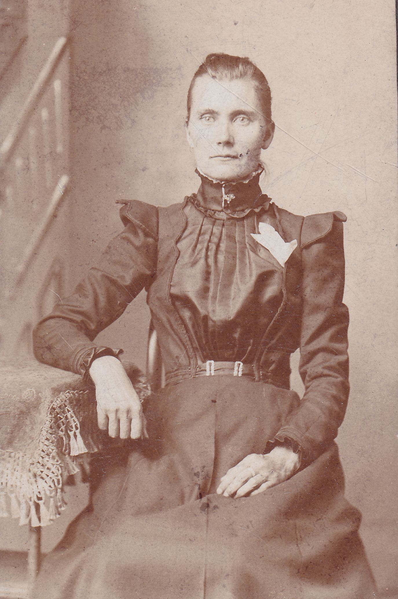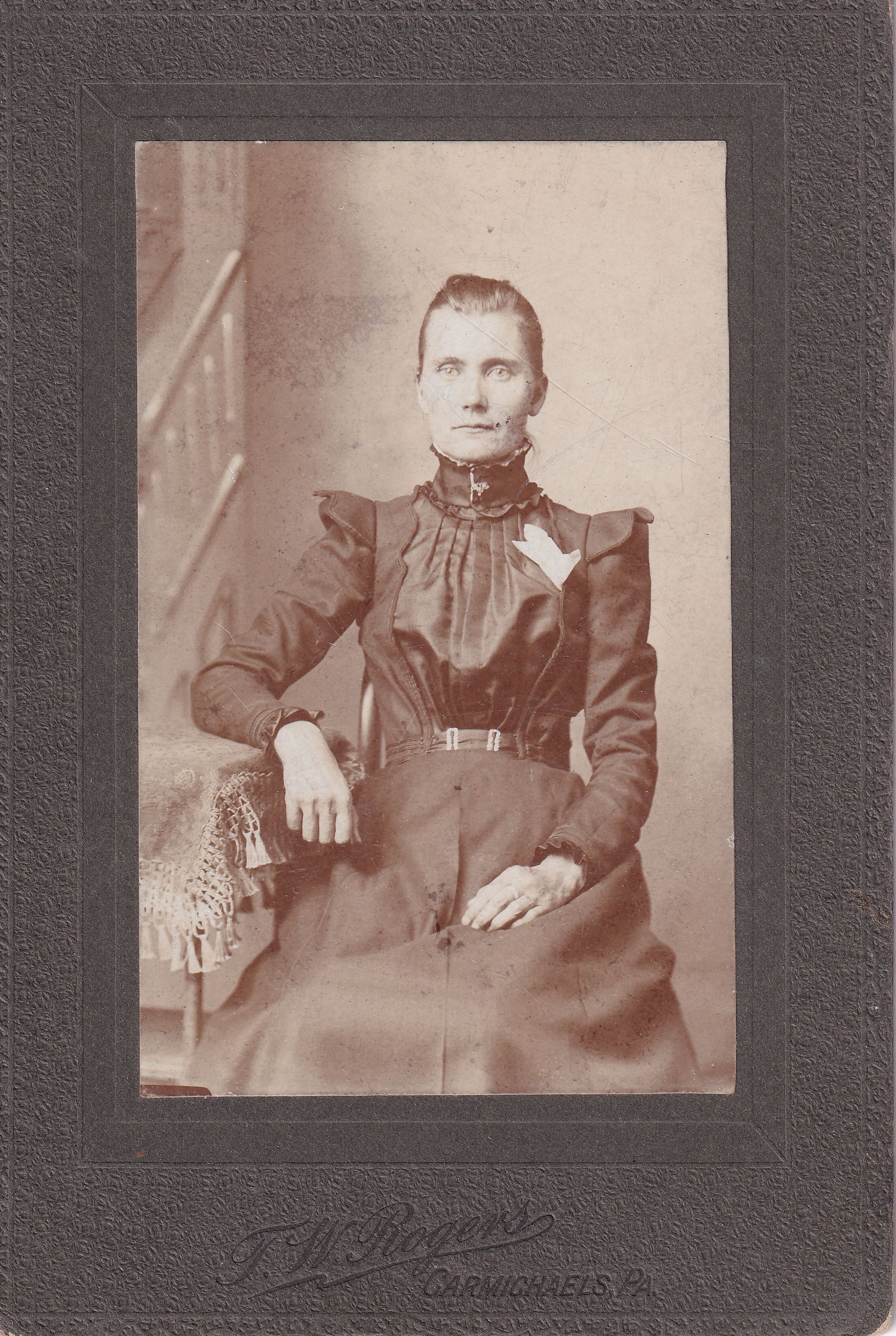 SOURCE CITATION: Clementine "Tina" (Ridge) Crago [1859-1930]; circa 1885-1895, image by T. W. Rogers, Carmichaels, Pa.; item no. RICL-AN003-0011, Miscellaneous Series, Rices Landing Lock and Dam No. 6 Museum Collection, Greene Connections Archives Project (www.GreeneConnections.com).