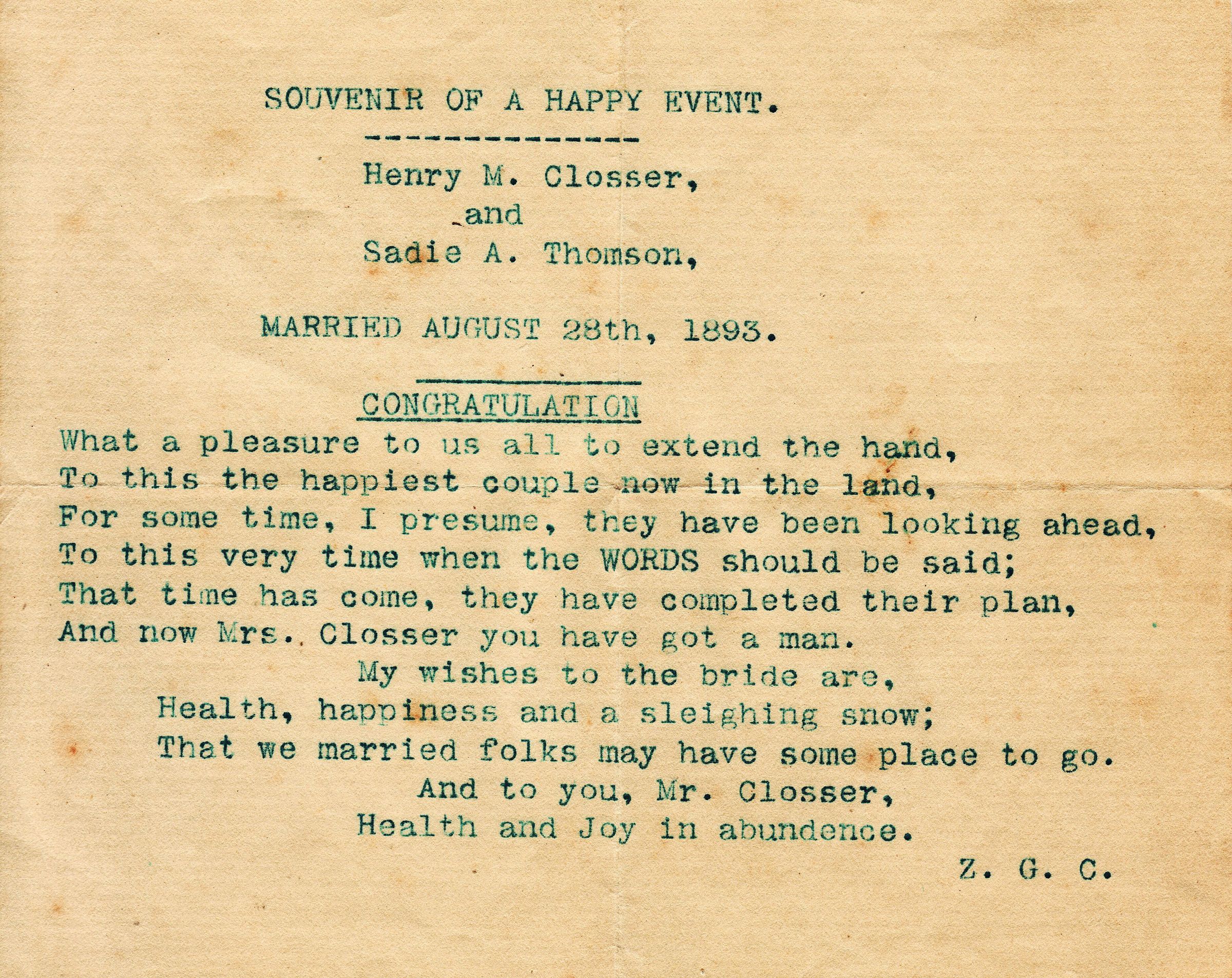 Wedding card addressed to Henry Moninger Closser and his second wife, Sarah Ann "Sadie" Thompson. They were married 28 August 1893.