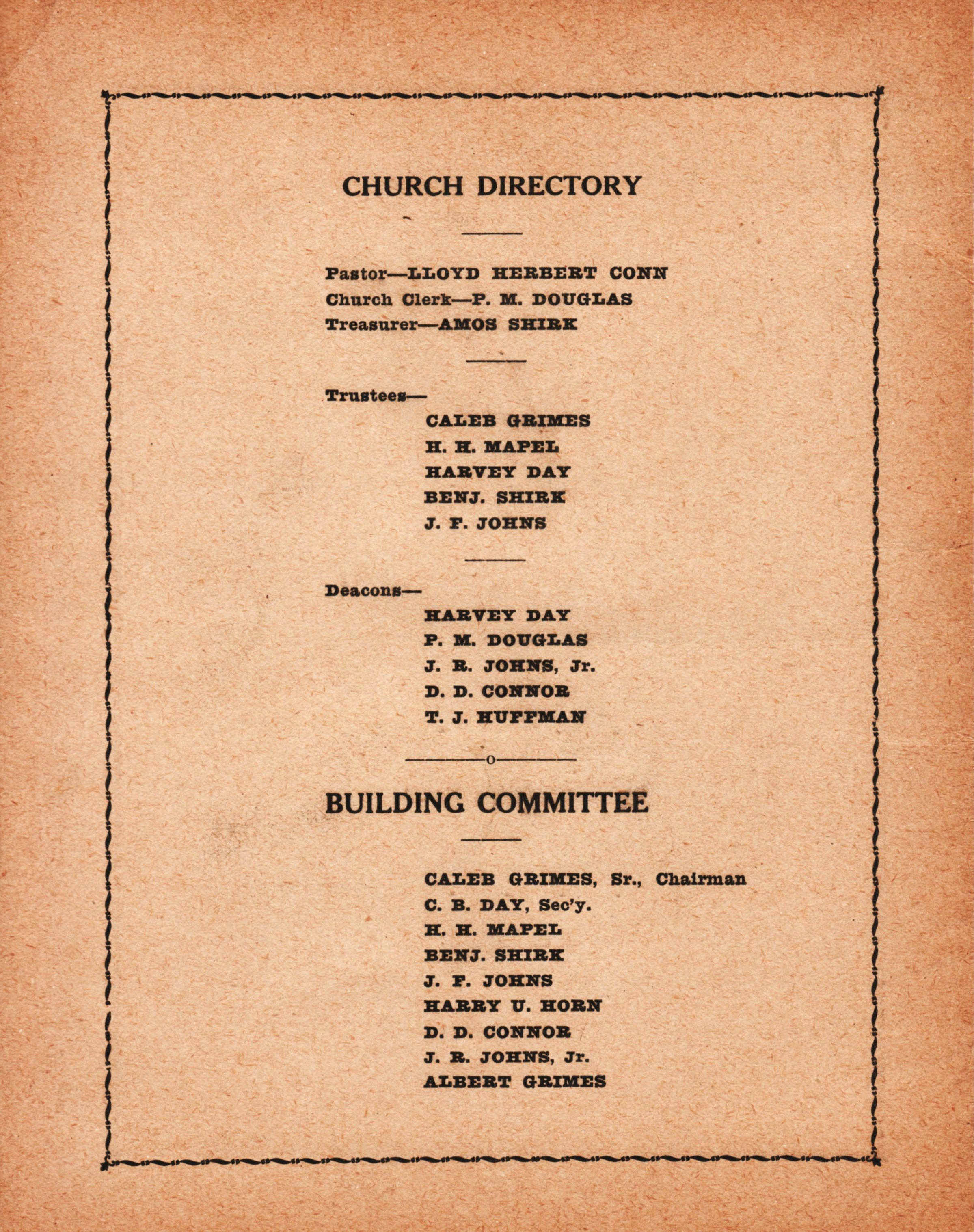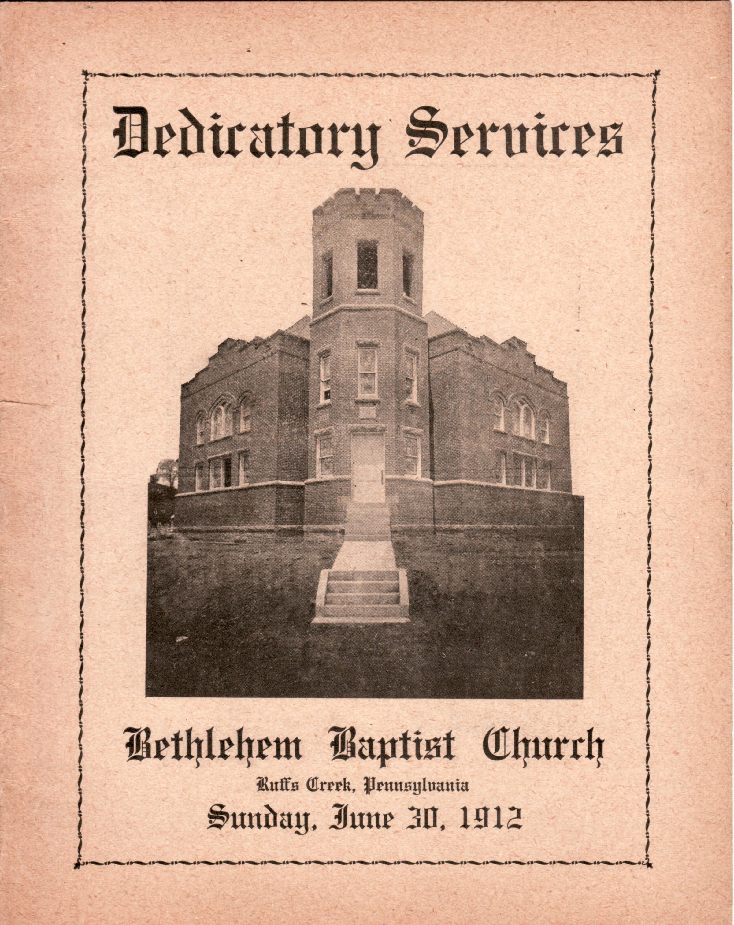 Conn family, Connor family, Day family, Douglas family, Grimes family, Horn family, Huffman family, Johns family, Kelley family, Mapel family, Maxwell family, Programs (Publications), Shirk family, Washington (Greene County, Pa. : Township)--Church buildings--Bethlehem Baptist Church