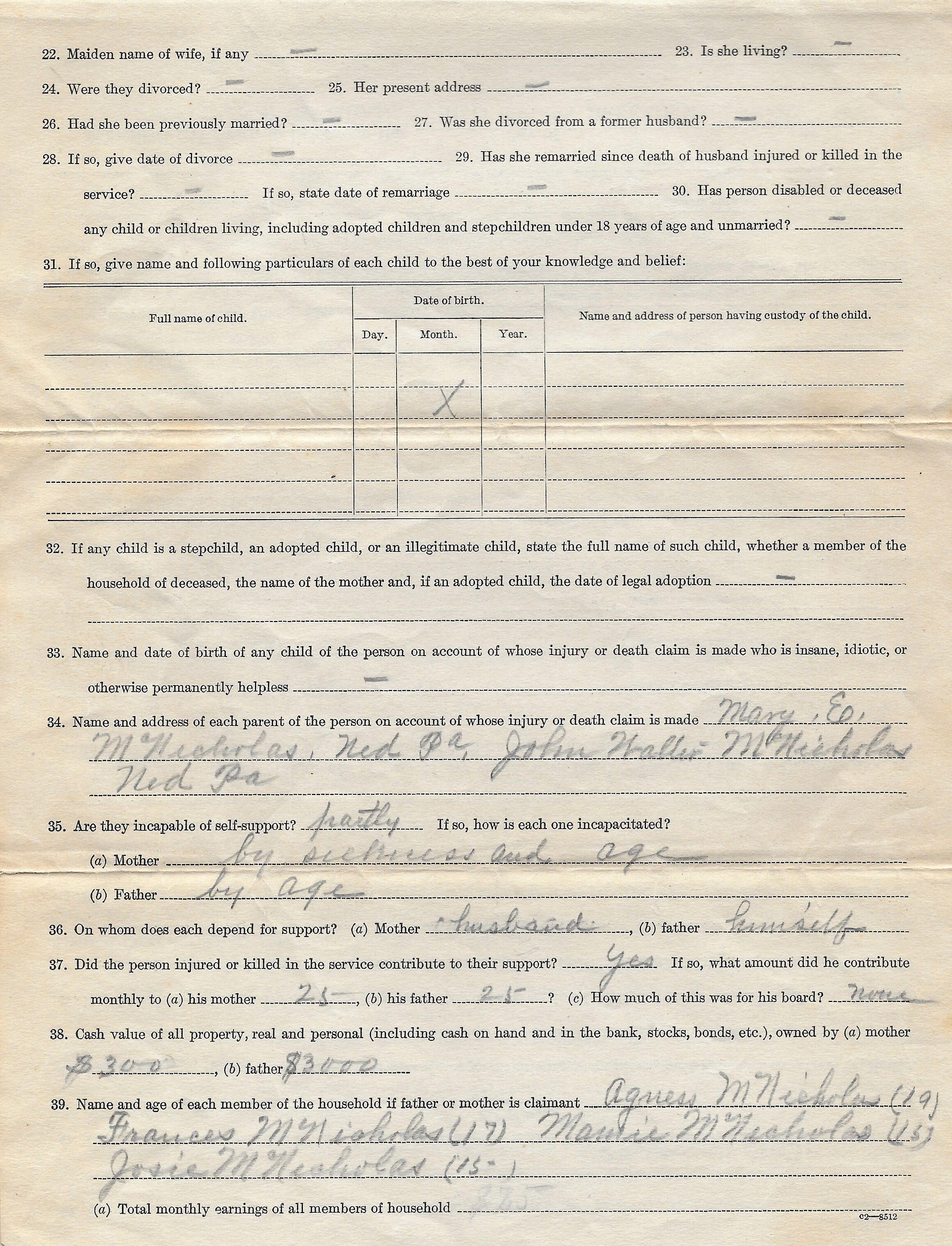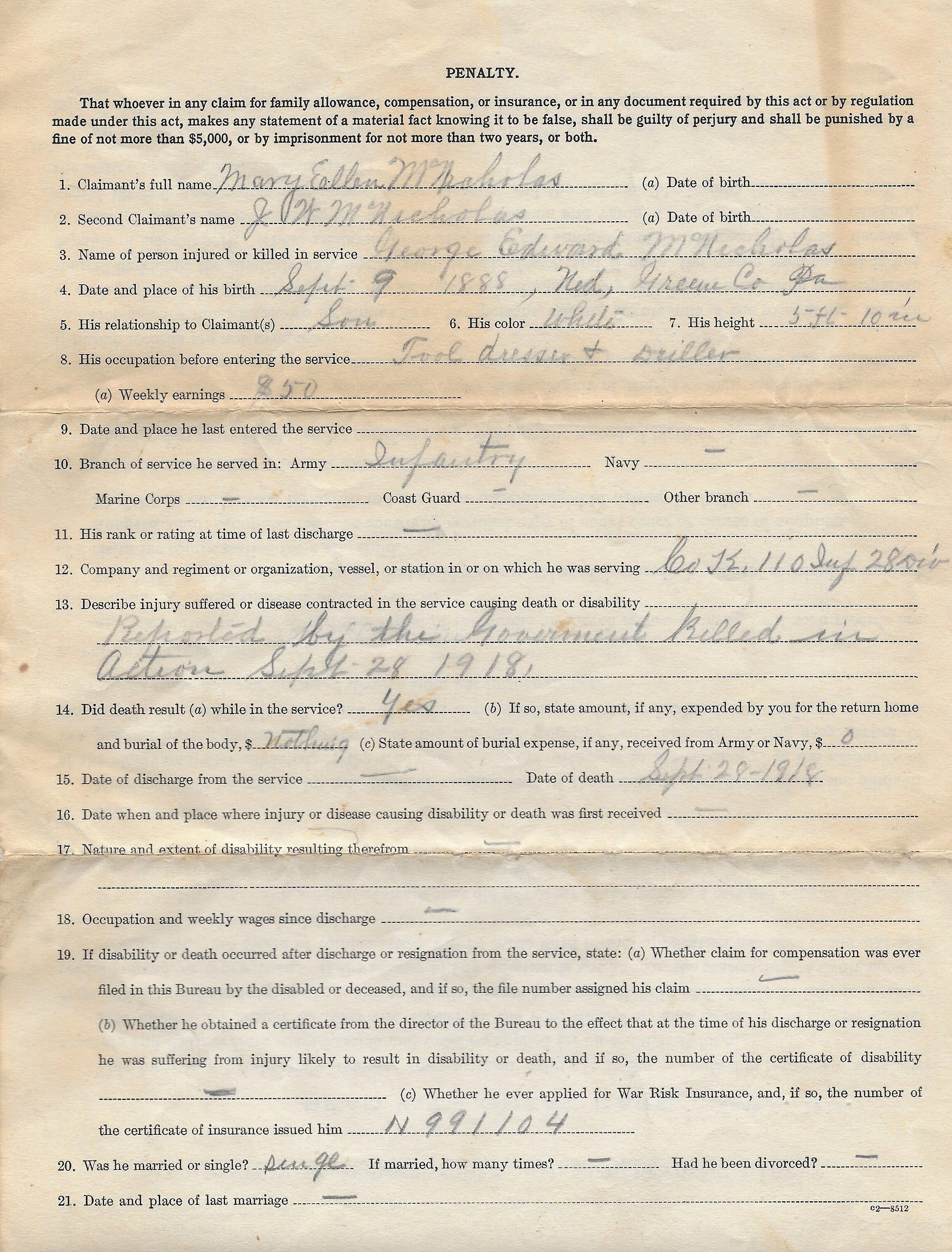 Source Citation: Compensation claim filed by Mary Ellen and J. W. McNicholas, as beneficiaries of their son George Edward McNicholas, who died of wounds received in action during World War I, item no. MCNI-AN001-0013, McNicholas Family Collection, shared by Joseph McNicholas, Greene Connections Archives Project (GreeneConnections.com).