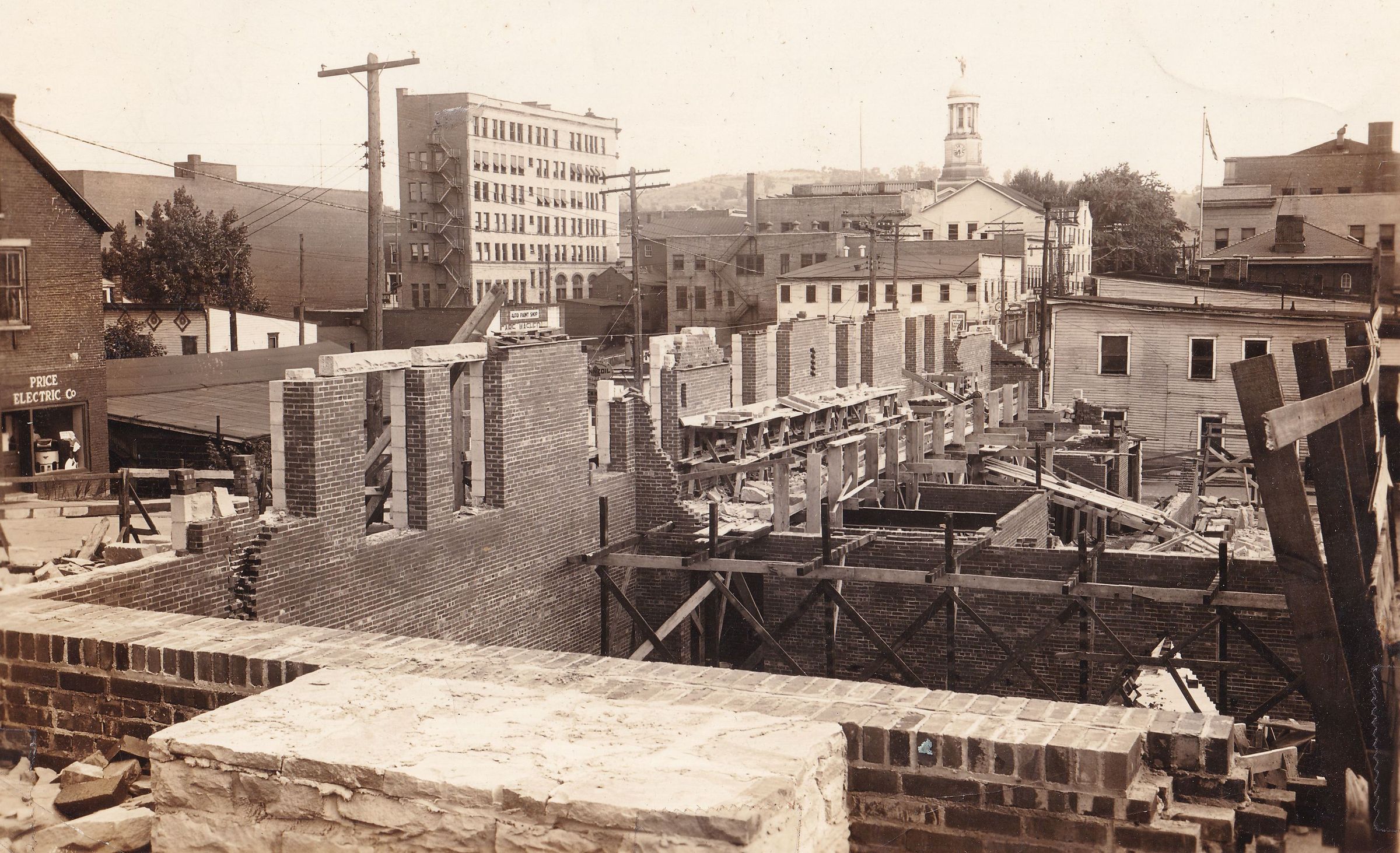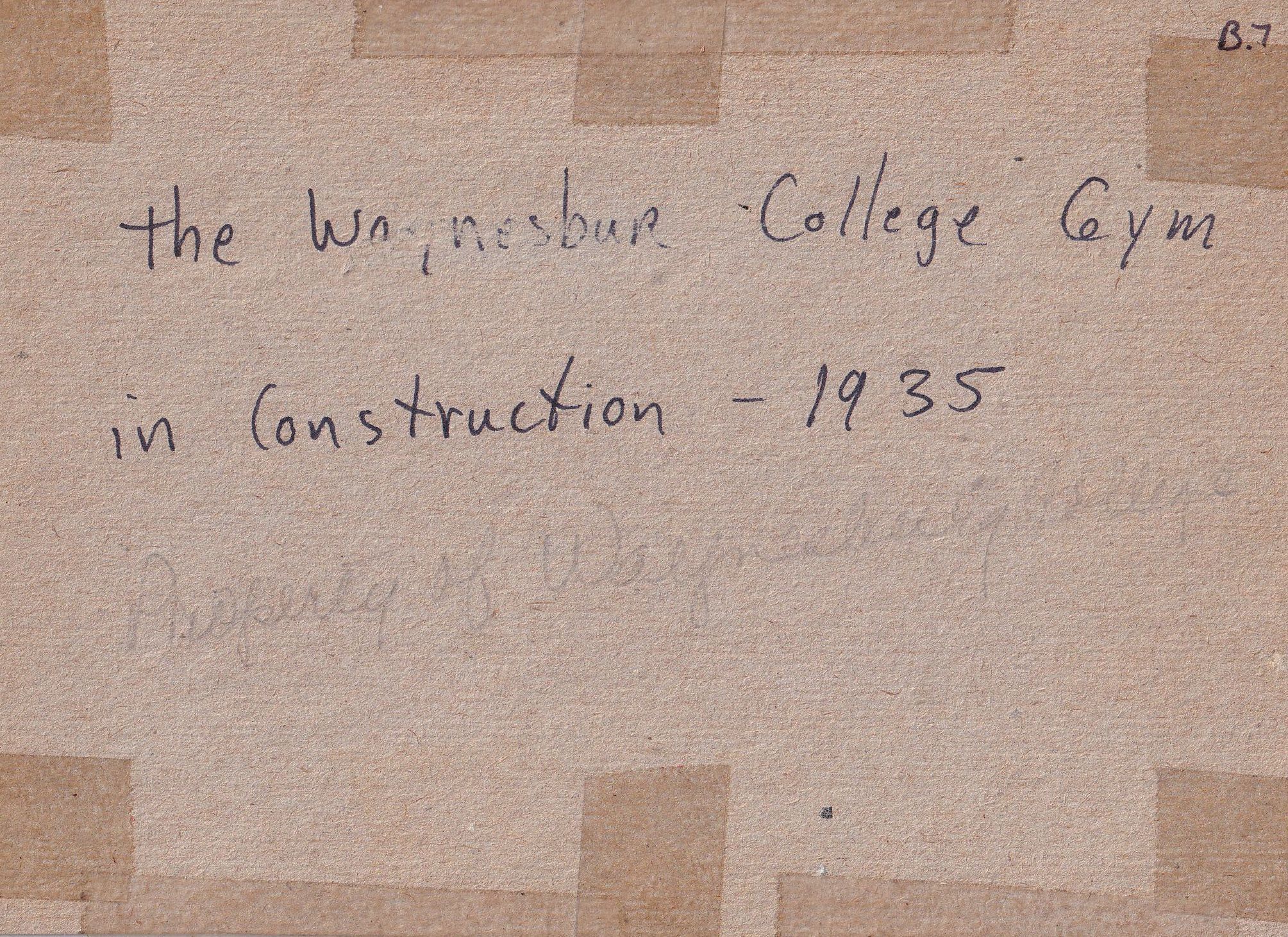 SOURCE CITATION: Construction of the Gymnasium on the Waynesburg College campus, corner of Wayne Street and Washington Street, in Waynesburg, Greene County, Pennsylvania; dated 1935; item no. WAYN_AN004_0018, Waynesburg University Paul R. Stewart Museum Collection, Greene Connections Archives Project (GreeneConnections.com).