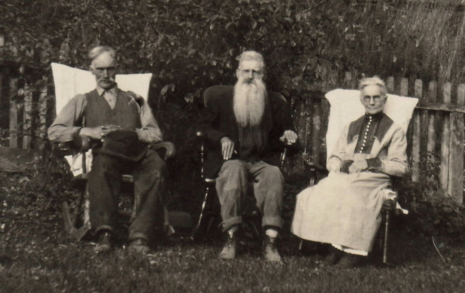 SOURCE CITATION: [Left-Right]: Samuel Harvey Cook [1853-1934], Jacob Martin Braddock [1842-1930], Margaret (Cook) Braddock [1849-1929]; circa 1925; item no. CAND_AN001_0002, Cook Series, Candice Lynn Buchanan Collection, Greene Connections Archives Project (GreeneConnections.com).