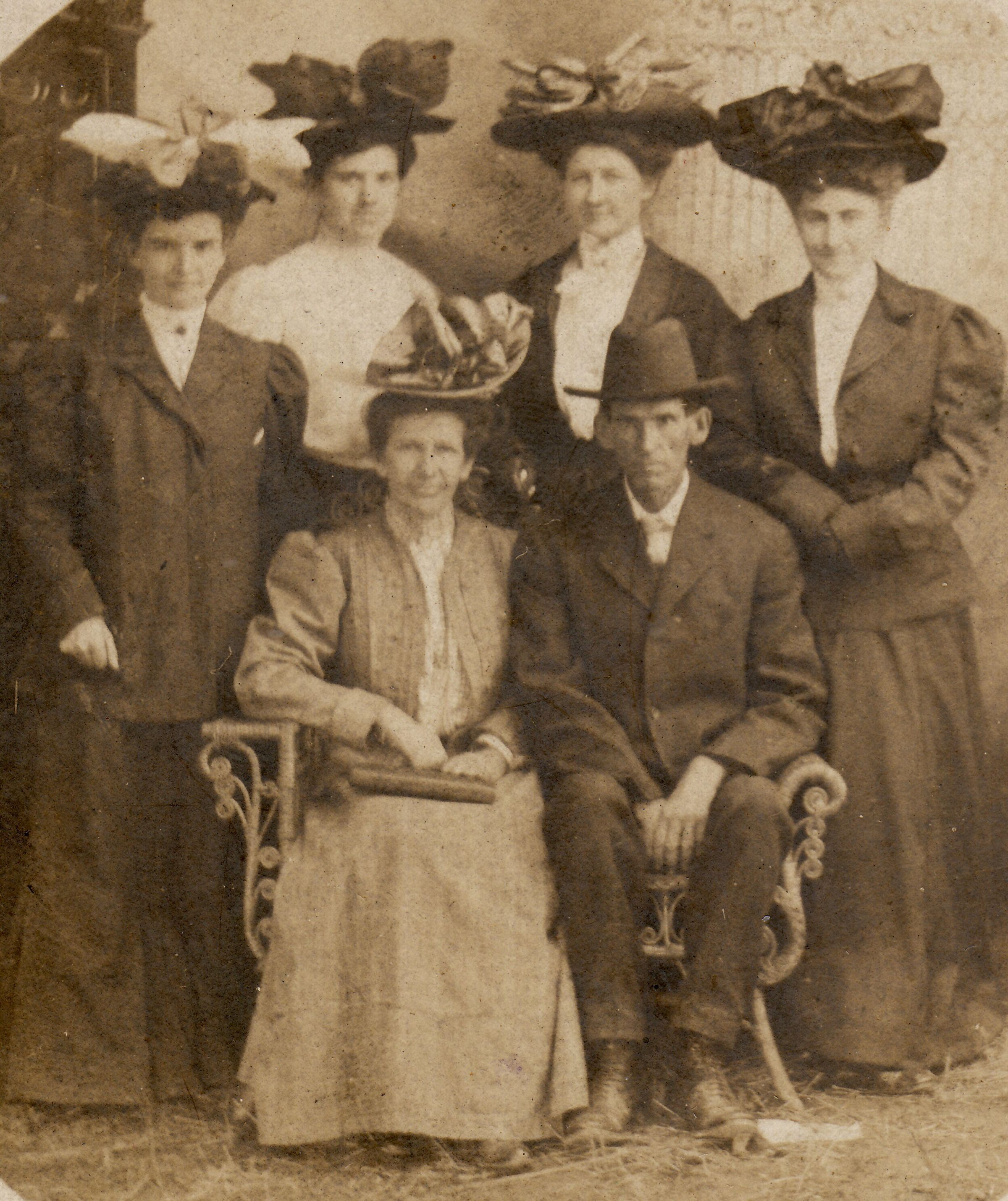 Source Citation: [Left-Right]: BACK - Elsie (Crawford) (Areford) DePoe [1882-1961], Mary Jane (Grimes) Tustin [1885-1980], Nora Crayne [1886-1969], Unidentified, FRONT - Harriet Laura Inghram [1864-1953], Arthur Samuel Inghram [1861-1932], item no. CGSP_AN003_0046, Lynn Myers Crayne Series, Cornerstone Genealogical Society Collection, Greene Connections Archives Project (www.GreeneConnections.com).