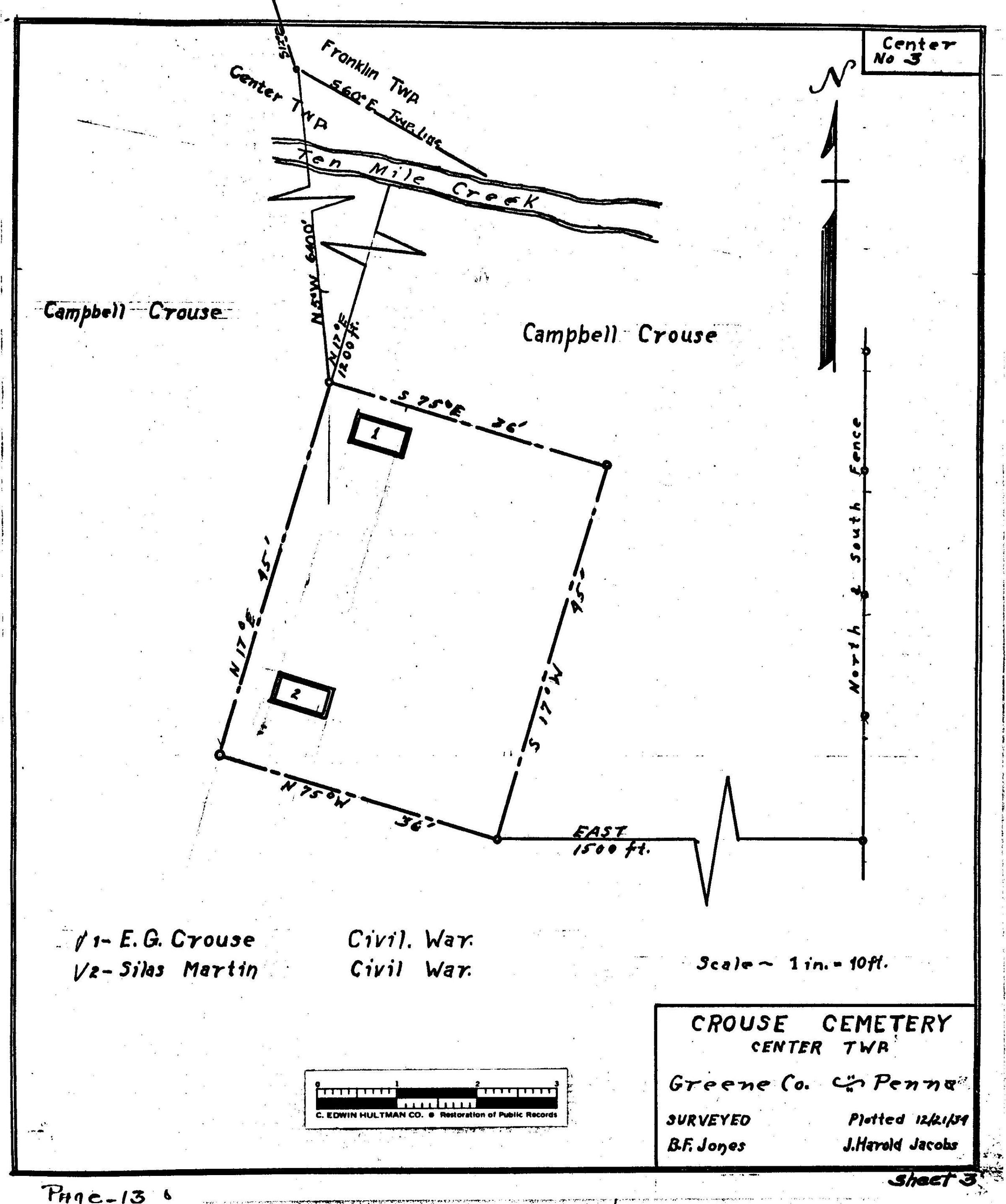 Source Citation: WPA Cemetery Plat - Pennsylvania - Greene County - Center Township - Crouse Cemetery (1934), item no. 2016.3.31, Cemetery Plat (WPA) Collection, surveyed by Works Projects Administration, copy on file at the Clerk of Courts Office, Greene County Courthouse, Greene Connections Archives Project (www.GreeneConnections.com).