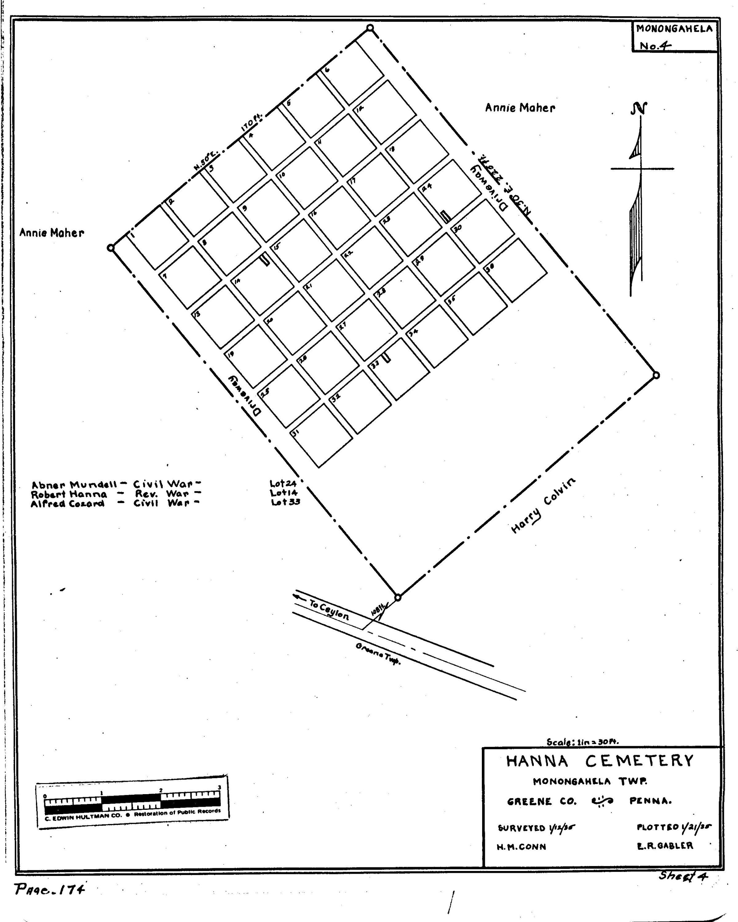 SOURCE CITATION: WPA Cemetery Plat - Pennsylvania - Greene County - Monongahela Township - Hanna Cemetery (1935); item no. 2016.3.364, Cemetery Plat (WPA) Collection, surveyed by Works Projects Administration, copy on file at the Clerk of Courts Office, Greene County Courthouse; Greene Connections Archives Project (GreeneConnections.com).