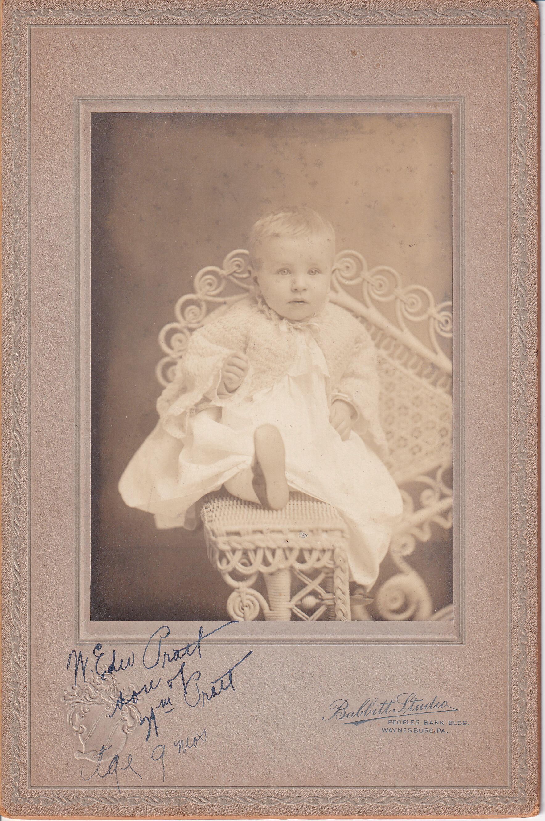 Source Citation: William Edward Pratt [1909-1939] - son of William Pratt and Nancy Ellen Rush; image by Babbitt Studio, Peoples Bank Bldg., Waynesburg, Pa., circa 1910; item no. AULD-AN001-0006-1, Pratt Series, Pratt-Auld Collection, shared by Julia Kathryn Johnson, Greene Connections Archives Project (www.GreeneConnections.com).
